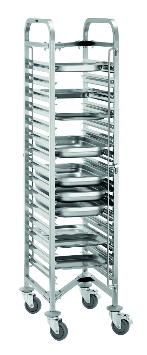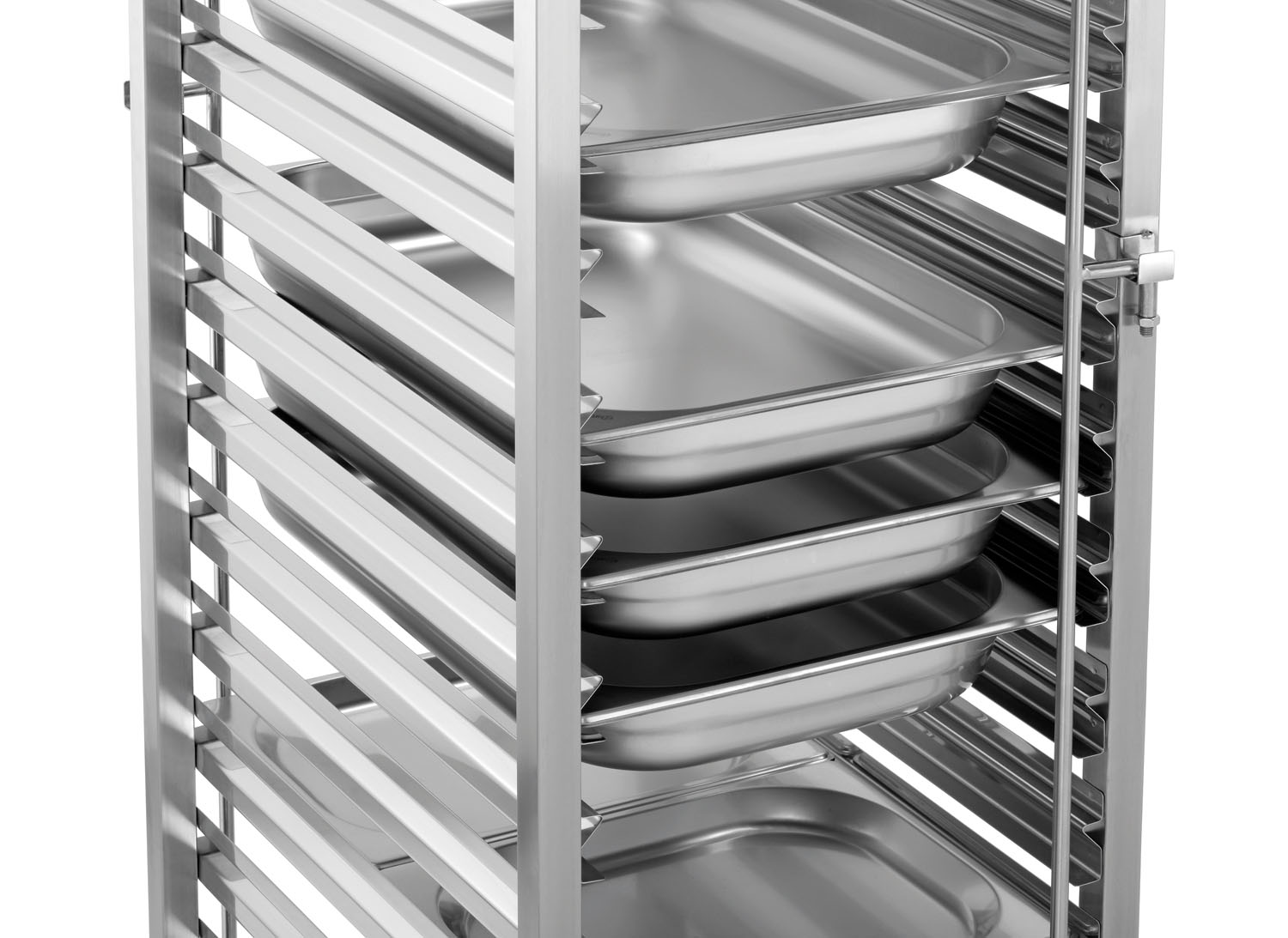 Gastronormwagen mit 15 Einschüben im GN-Format und einer maximalen Tragfähigkeit von 150 kg. Die besondere Bauweise ermöglicht ein ineinanderschieben von 2 oder mehr Gastronormwag…