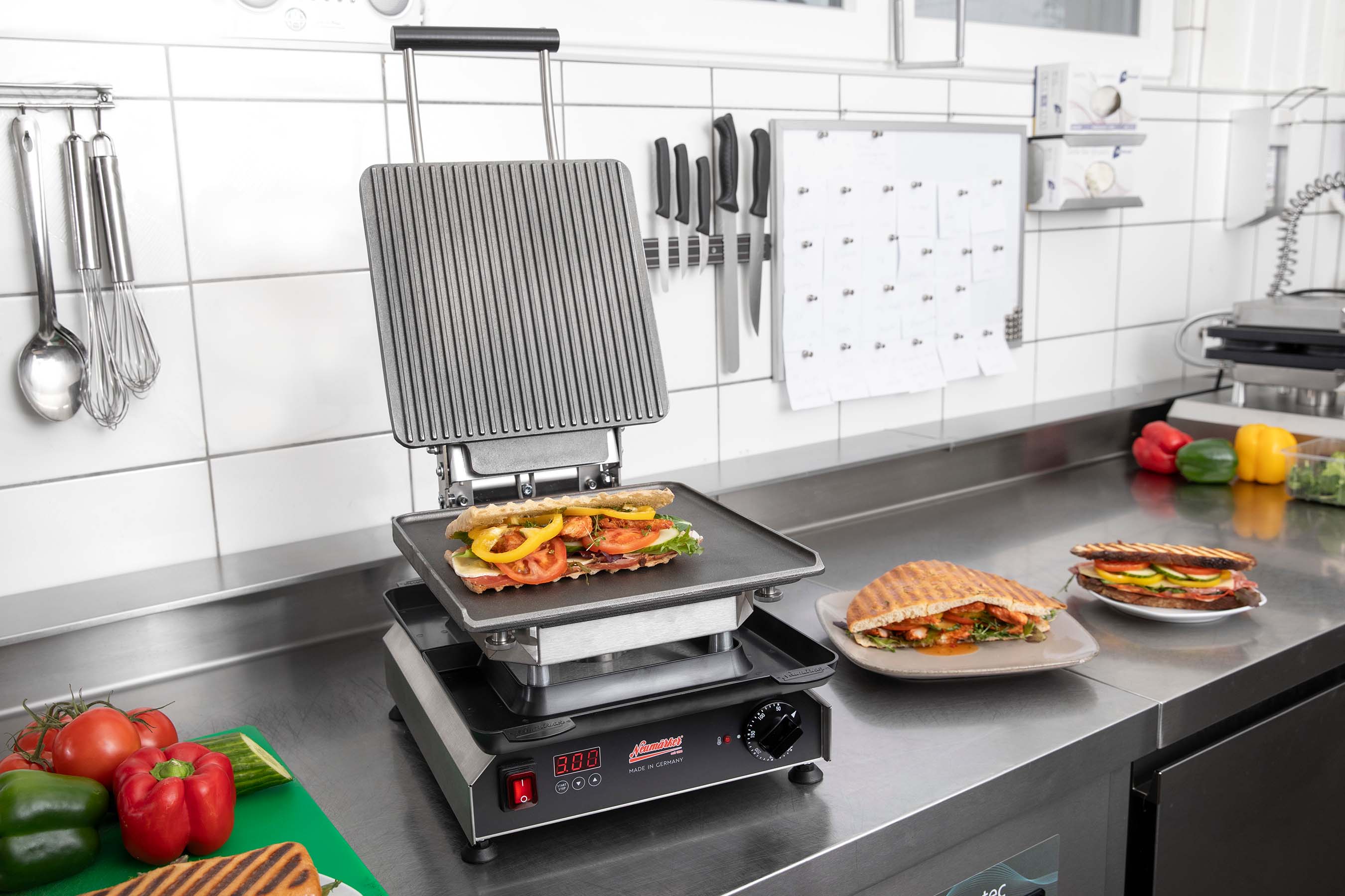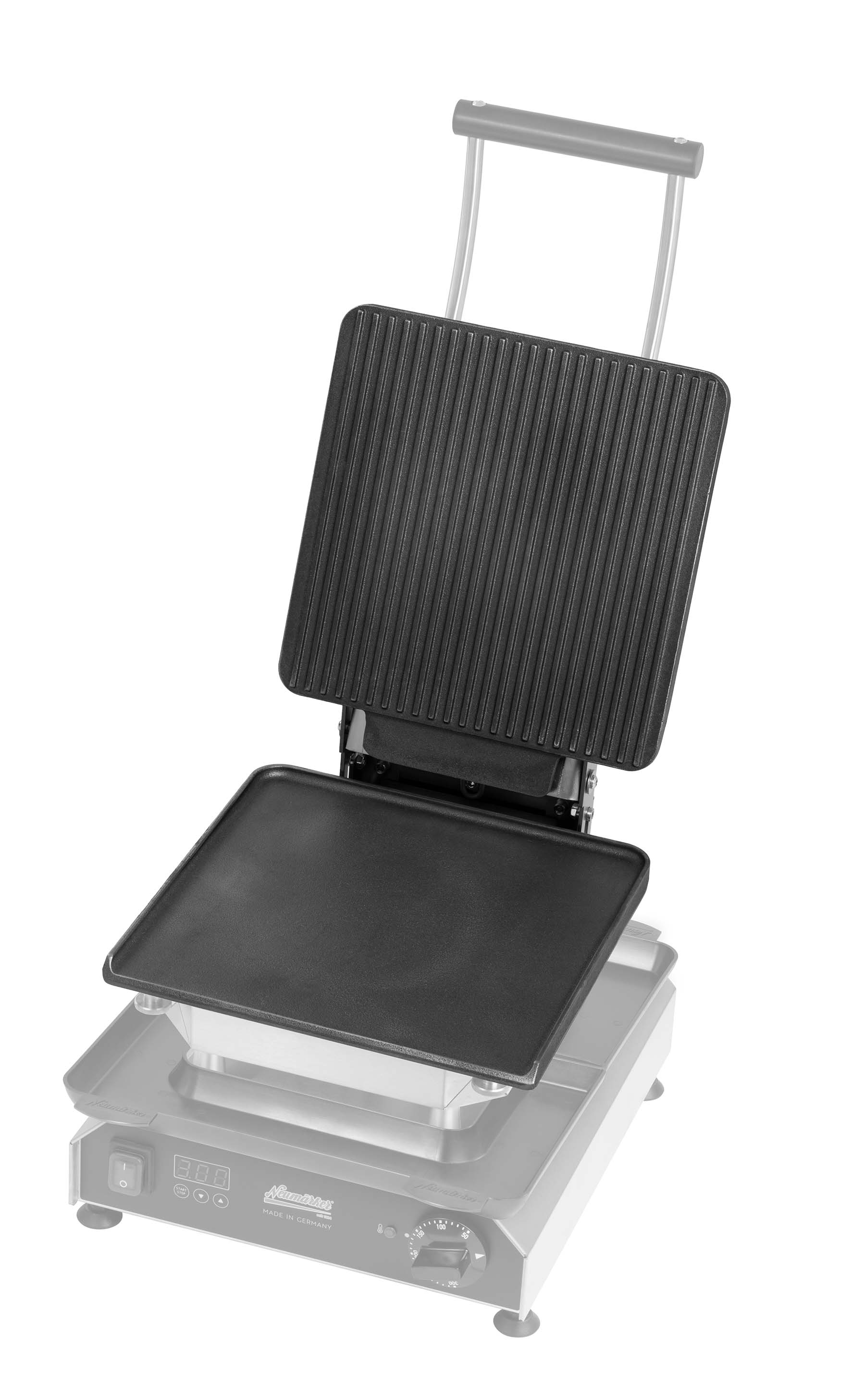 Exklusiv für den Thermocook. Mit der Panini-Grillplatte machen Sie Ihren Thermocook zum ausgewachsenen Kontaktgrill. Für Paninis, Brötchen, Toast, Fladenbrot, u.v.m. Ideal, um belegte Brötchen und Paninis vor dem Servieren kurz knusprig zu erhitzen. • Grillfläche 280 x 280 mm • Massives Gusseisen sorgt für eine überragende Hitzespeicherung. Dies garantiert eine schnelle Zubereitung und das perfekte Grillmuster auf den Speisen • Die Platten aus klassischem Gusseisen benötigen keine Antihaftbeschichtung und sind unempfindlich gegenüber mechanischen Einwirkungen. So können sie intensiv gereinigt werden, ohne Beschädigungen am Material befürchten zu müssen. • Stufenlos höhenverstellbar: Parallele Grillplatten 0 bis 44 mm • Kraftunterstützende Feder für ein einfaches Öffnen • Max. Öffnung der Grillplatten 100 Grad (Winkel) • Nicht geeignet für Backsystem-Adapter