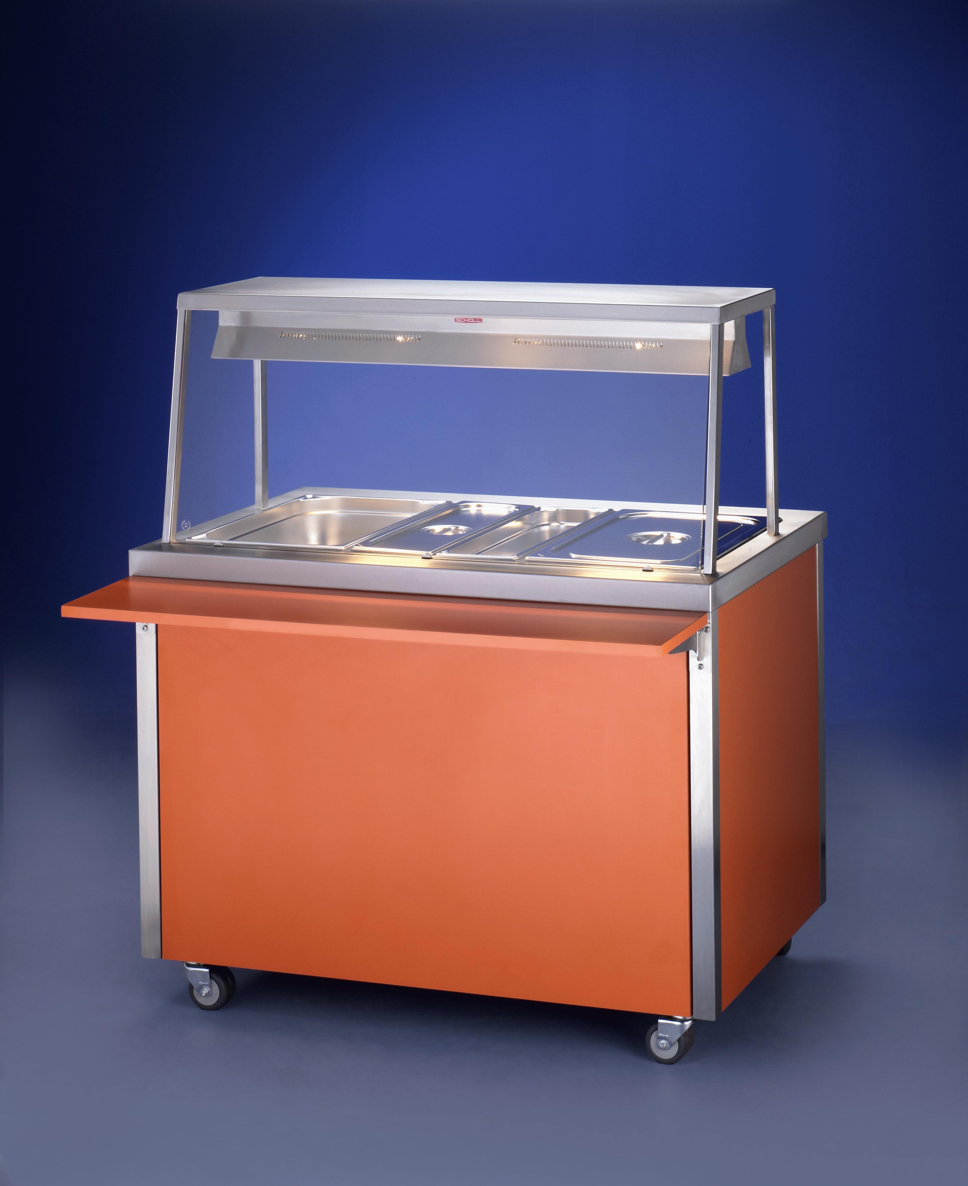 Young Line Warmausgabe 1450 x 750 x 850/1300 mm. Ausführung: Bain-marie CNS 18/10, passend für 4 GN-Einheiten 1/1-150, Wanne durchgehend beheizt. Heizung thermostatisch regelbar von 30-90°C. CNS-Aufsatz mit 3 IRK-Quarz-Halogen-Strahlern à 400 Watt. Front- scheibe aus Sicherheitsglas. Unterbau frontseitig verkleidet, mit Grundbord. Klappbare und aushängbare Tablettrutsche, Resopal beschichtet. Fahrbar durch 4 Lenkrollen, 2 davon feststellbar. E-Anschluß: 400V/4,0 kW.