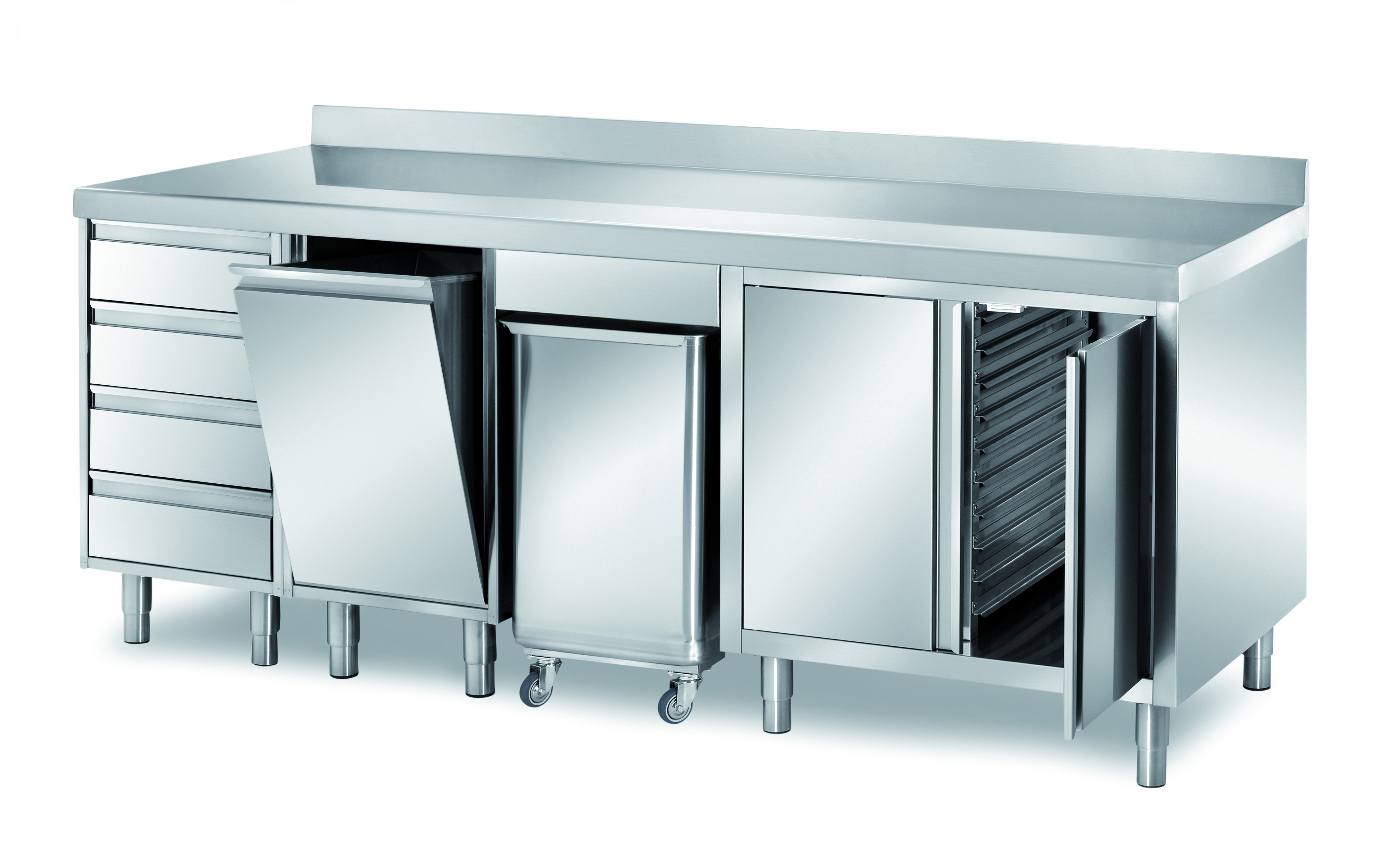 GastroXtrem Edelstahl-Unterbauelemente und Unterbaumodule mit 2 Schubladen ohne Tischplatte, alle Unterbauelemente sind als Edelstahl Sonderbaumöbel auf Anfrage lieferbar.