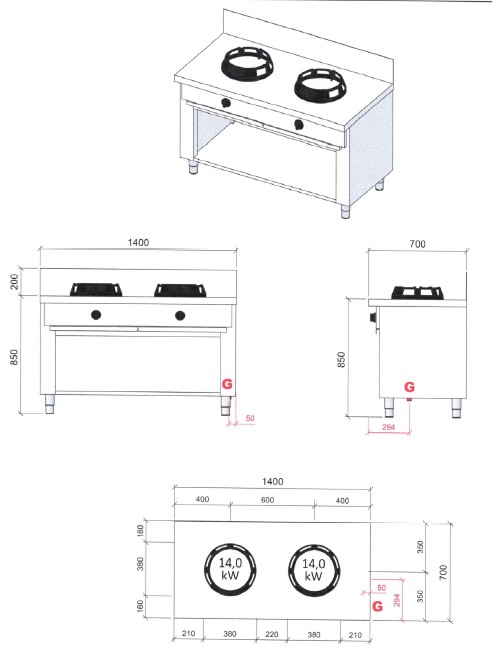 % 4.198,00 € (31.68% gespart)Produktinformationen "CASTA CC02, Gas Chinaherd, 2 x 14kW Benner, 28kW, Wand-Modell Breite 1400mm"