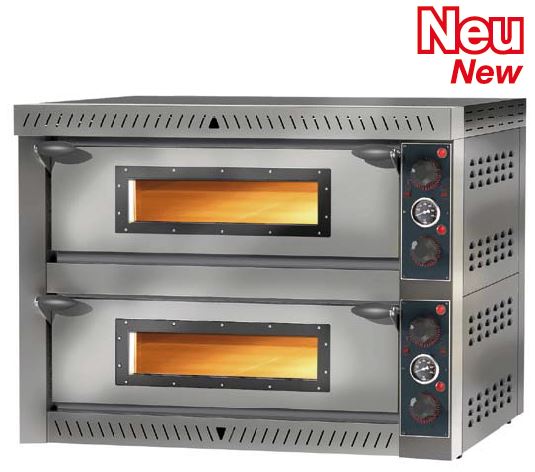 für 8 Pizzen à Ø 32 cm • Backkammer 660x660x150 mm • Innenkammer Aluminium • Front Edelstahl • Tür mit Sichtfenster • Innenbeleuchtung • Schamottsteinboden • Ober- und Unterhitze getrennt regelbar bis 450°C • großes Themometer an Gerätefront