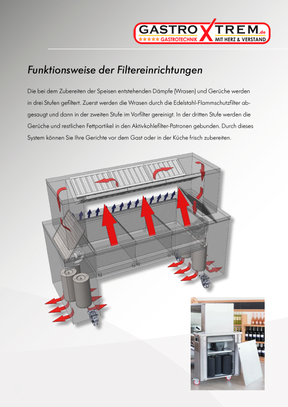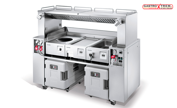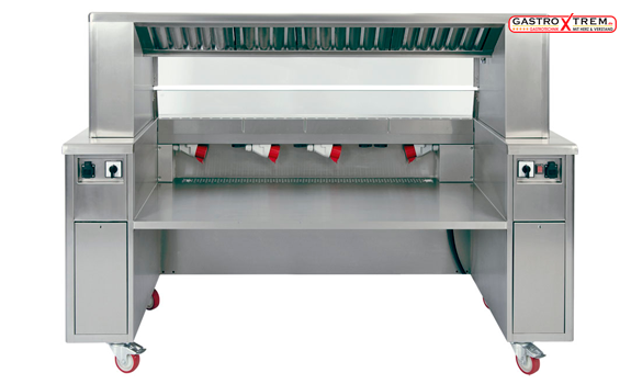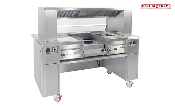 SCHOLL- Air-Cleaning-System; Somit können Sie überall dort die Speisen vor den Augen Ihrer Gäste zubereiten, wo Sie die Kochmöglichkeit benötigen. Kochen können Sie hier genauso wie Sie es von der Hauptküche gewohnt sind.