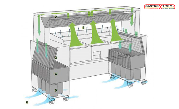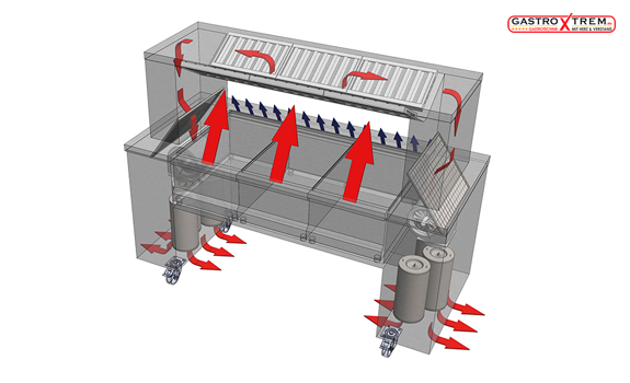 Die richtige Luftqualität im Front Cooking System erfolgt über ein spezielles Umluft-Reinigungssystem, mittels Plasmatechnik (Plasmatechnologie). Die Ablufthauben, bzw. die Ablufttechnik ist in der Regel im Unterbau mit integriert.