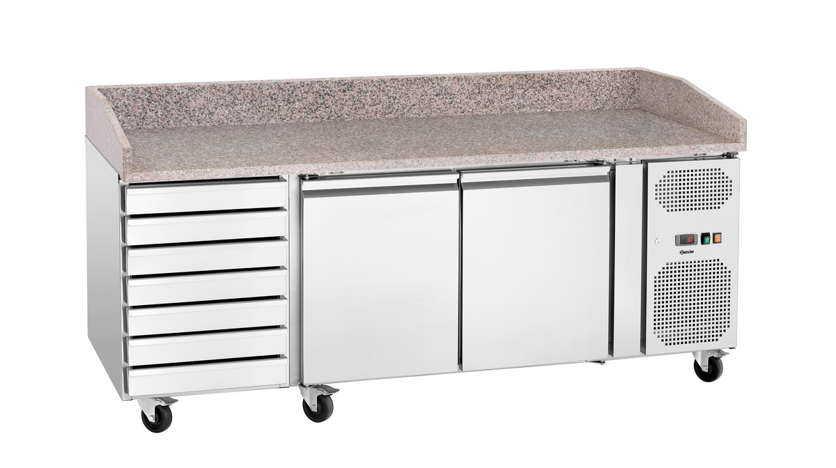 Der Pizzakühltisch G-S7T2 ausgestattet mit 7 Schubladen für Teigrohlinge und einer großzügigen Arbeitsplatte aus Granit ist der perfekte Mittelpunkt jeder Pizzeria. Der gekühlte Schrank hält mit 2 Türen die Zutaten frisch und griffbereit.