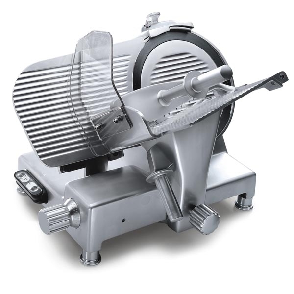 Der robuste Profi Alleschneider ist als Schrägschneider mit einem 35 cm großem Messer und einem Messerschleifer ausgestattet und in der Verwendung für jeder Art der Gastronomie anwendbar, der Motor ist belüftet.