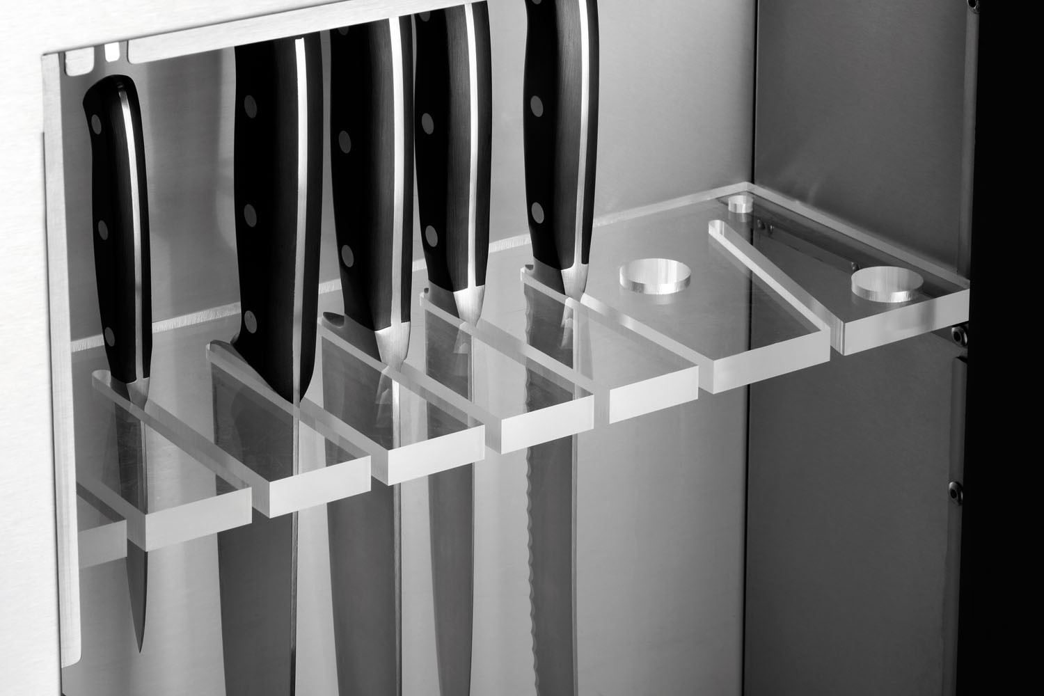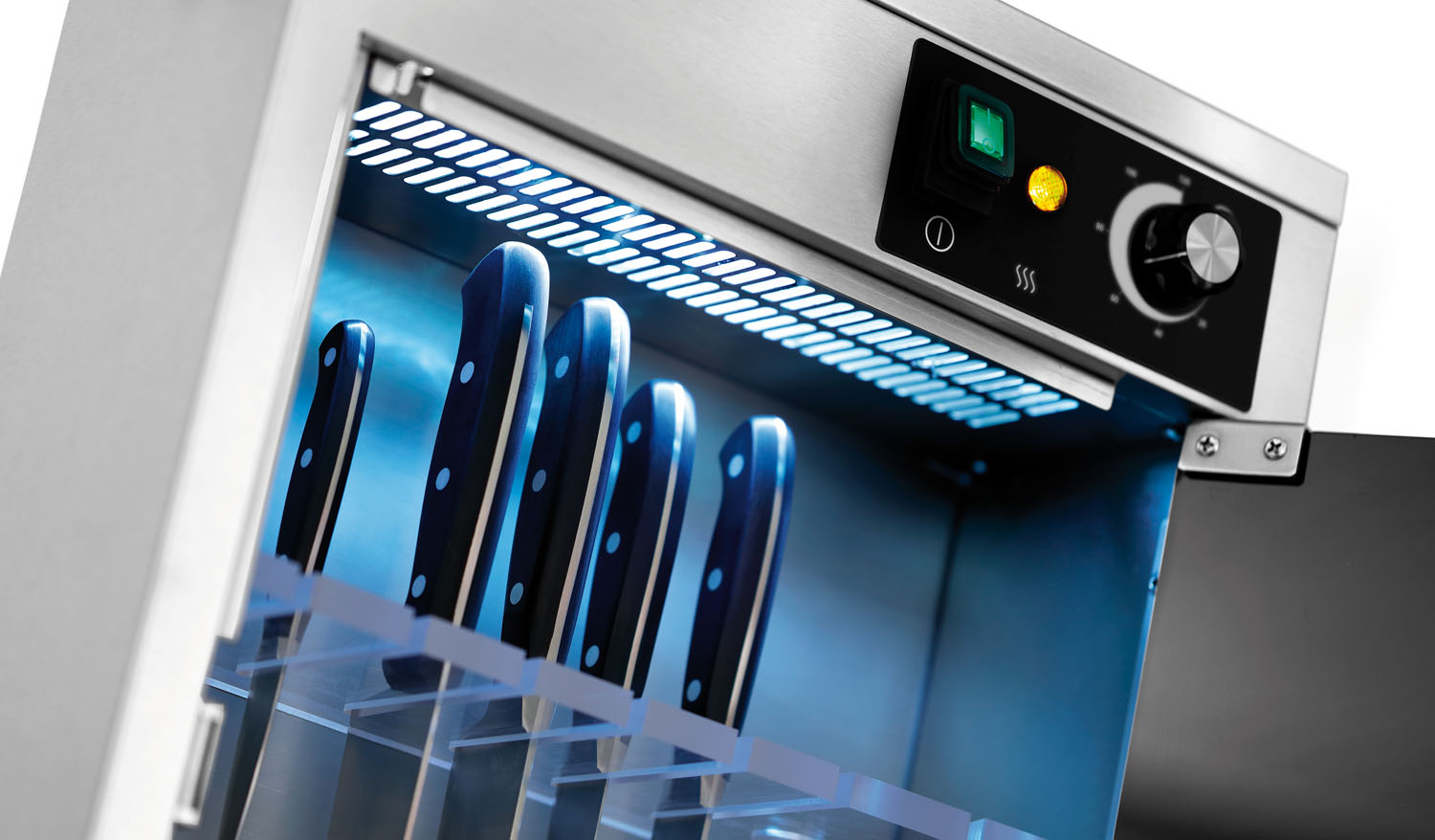 Hygiene – aber mit Sicherheit: Die schwarz getönte Scheibe schützt vor dem UV-Licht mit dem bis zu 9 Messer sterilisiert werden. Ganz einfach Messer einhängen, die Tür schließen und den Timer einstellen.