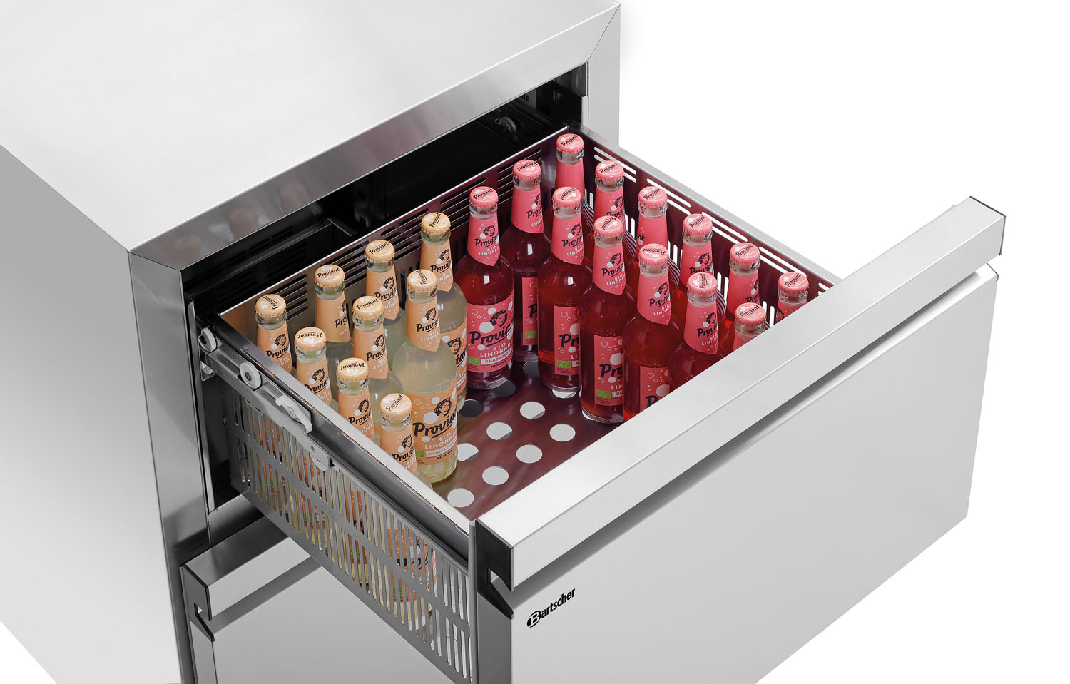 Der Schubladenkühler mit 2 Schubladen ist einbaufähig und somit bestens geeignet für den Einbau zwischen Schränken im Bar- und Schankbereich. Die Umluftkühlung und der Lochboden der oberen Schublade gewährleisten eine gleichmäßige Temperaturverteilung.