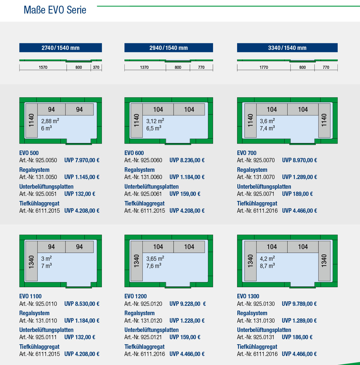 - EVO 1100: B 2.740 x T 1.740 mm mit passendem Regalsystem 1310110 und Unterbelüftung 9250111