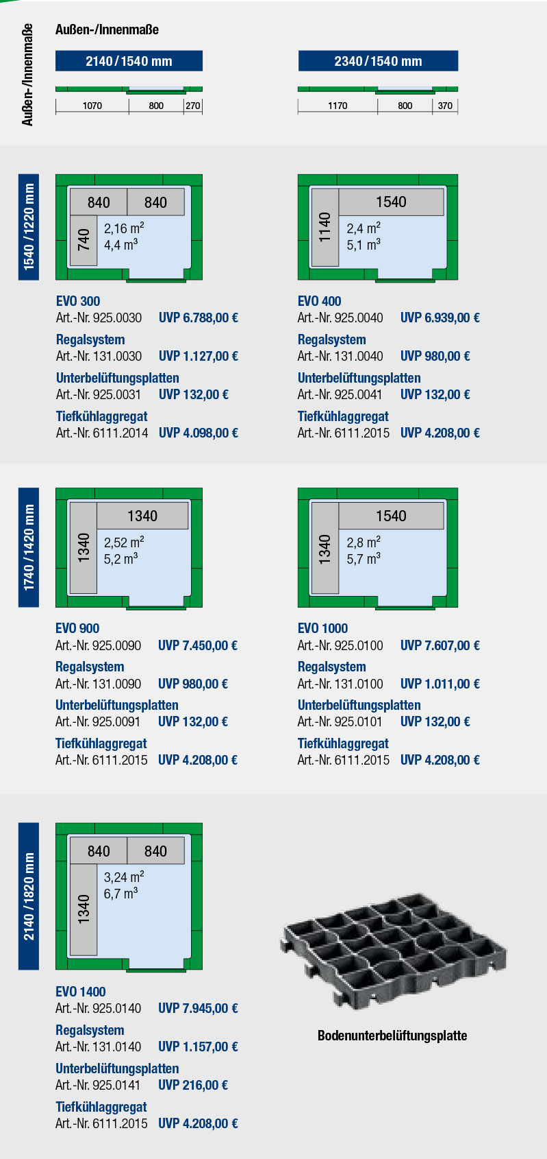 - EVO 300: B 2.140 x T 1.540 mm mit passendem Regalsystem 1310030 und Unterbelüftung 9250031