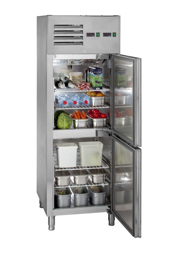 - Material: (Gehäuse und Innenraum) Edelstahl, - Tür selbstschließend, - 2 höhenverstellbare Roste pro Tür, - Digitale Temperaturregelung (DIXELL), - Isolierung: 60 mm, - Umluftkühlung, - Automatische Abtauung, - Kältemittel: R600a/R290, - Gewicht: 191 kg, - Maße: B 680 x L 830 x H 2010, - Inhalt: 2x 129 Liter, - temp. -2 / +8 und -18 / -22 °C, - Anschluss: K: 230 V - 50 Hz - 0,3 kW, T: 230 V - 50 Hz - 0,6 kW
