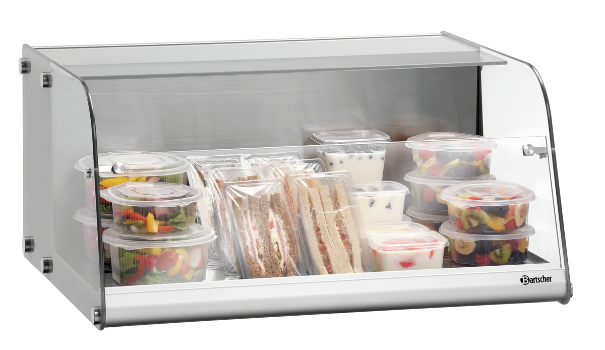Aufsatzvitrine für den Selbstbedienungsbereich – Ideal für kalte Getränke, Joghurts oder auch kühl zu lagernde Snacks wie z. B. Sandwiches, die auf der Edelstahl-Stellfäche von 645 x 300 mm ihren Platz finden. Die Öffnung an der Vorderseite der Kühlvitrine ermöglicht eine schnelle Enthnahme und verlockt schnell zu Impulskäufen.