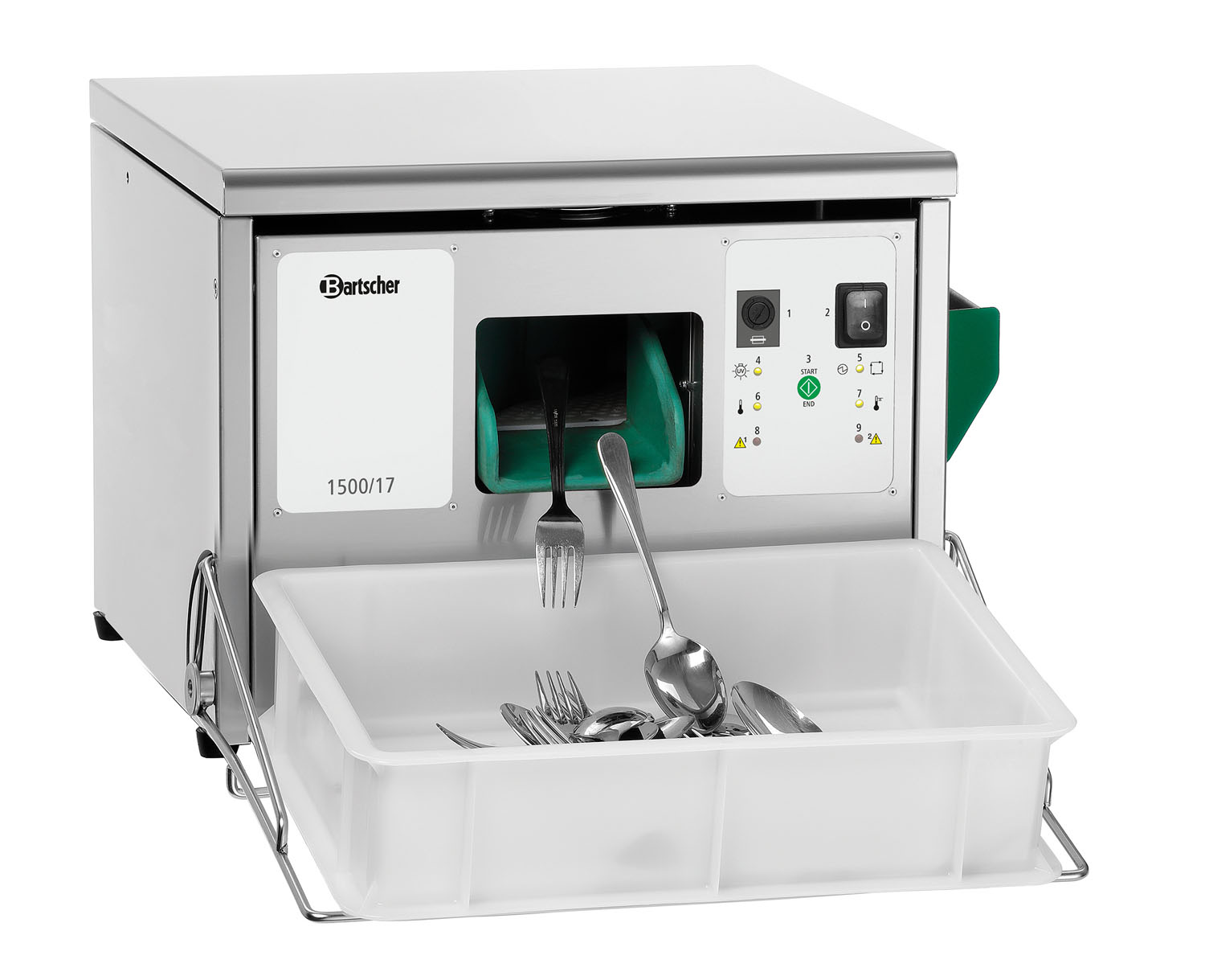 Kein Wackeln, kein Verrutschen – Mit dem Besteckkorbhalter landet das Besteck ganz sicher genau dort, wo es hin soll: Frisch poliert in den Korb der Besteckpoliermaschine 1500/17.