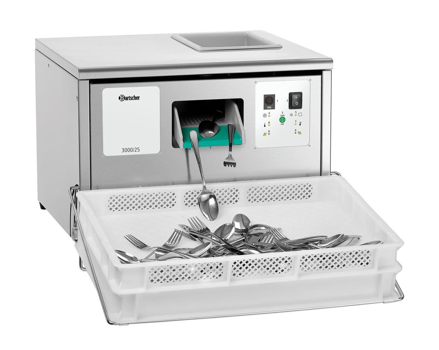 Kein Wackeln, kein Verrutschen – Mit dem Besteckkorbhalter landet das Besteck ganz sicher genau dort, wo es hin soll: Frisch poliert in den Korb der Besteckpoliermaschine 3000/25.