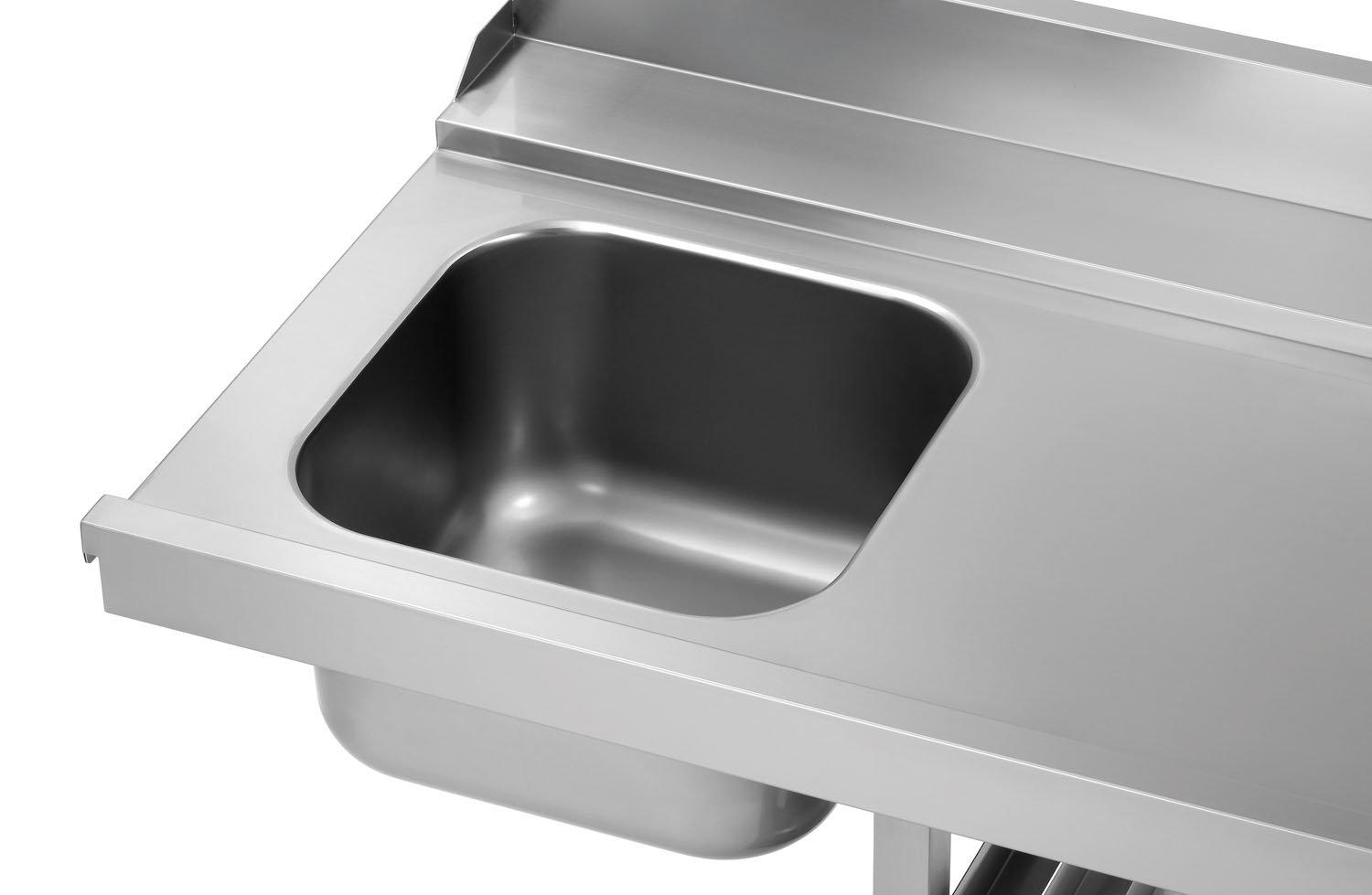 Die zu den Durchschubspülmaschinen DS passende Vorabräumung ist mit einem 40 Liter Spülbecken ausgestattet und ausgelegt für den rechtsseitgen Anbau. In den 3 praktischen Spülkorbeinschüben können 500x500er und 600x500er Körbe mit einer Höhe von bis zu 145 mm verstaut werden.