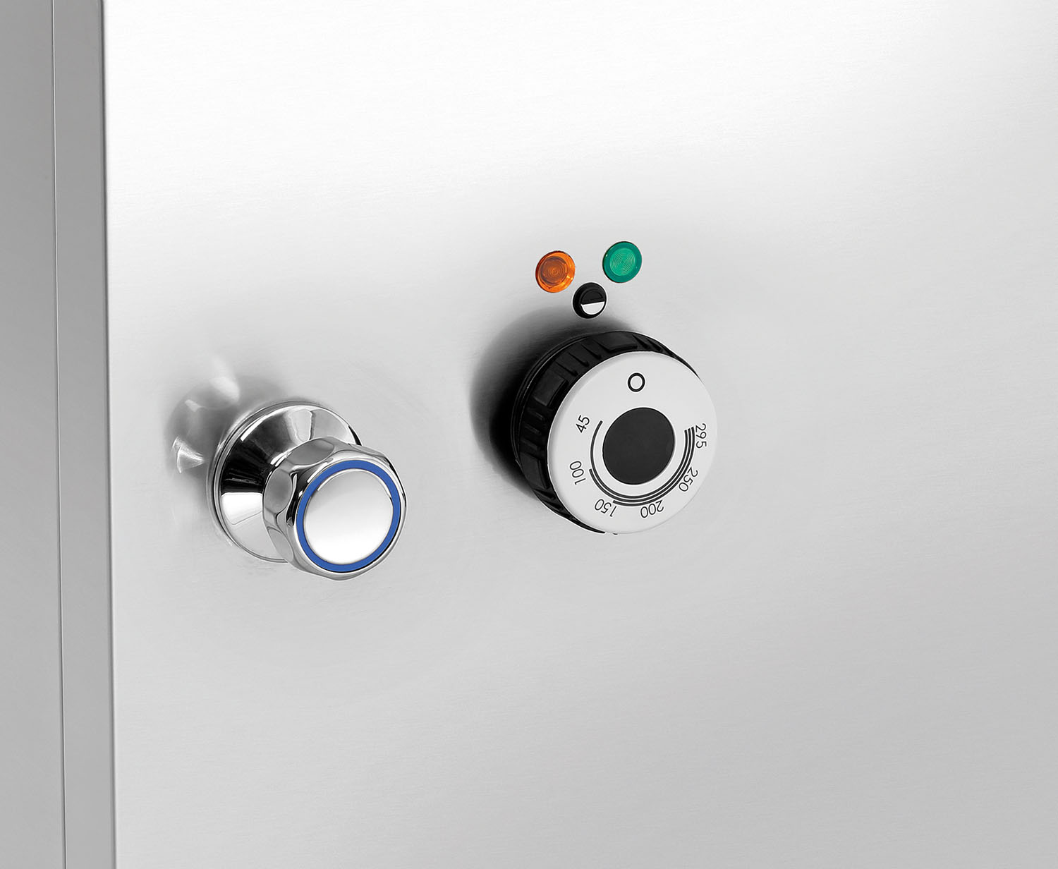 Kippbratpfanne der Serie 900 in bekannter hochwertiger Edelstahl-Ausführung. Der Tiegel ist vollständig aus Edelstahl und fasst bis zu 70 Liter. Das Elektro-Modell mit manueller Kippvorrichtung verfügt über einen Wassereinlaufhahn und ist ausgelegt für einen Kalt- oder Warmwasseranschluss.
