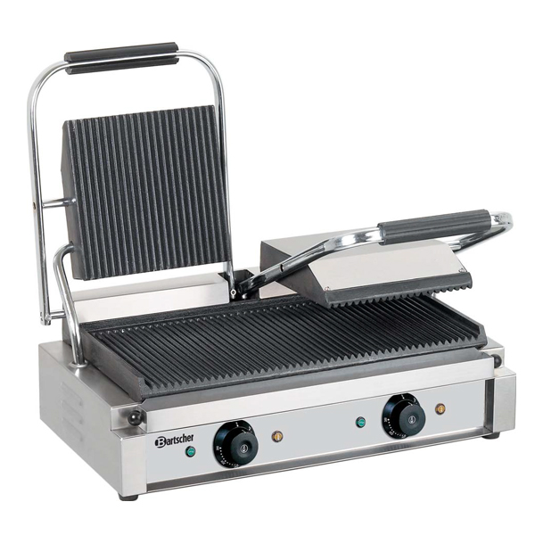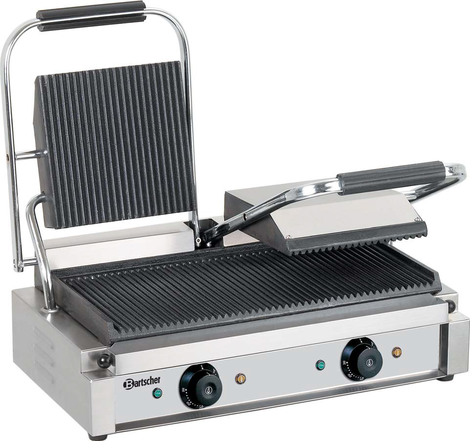 Dieser Kontaktgrill von Bartscher besitzt zwei unabhängige Grillflächen, die beide von oben und unten gerillt sind.