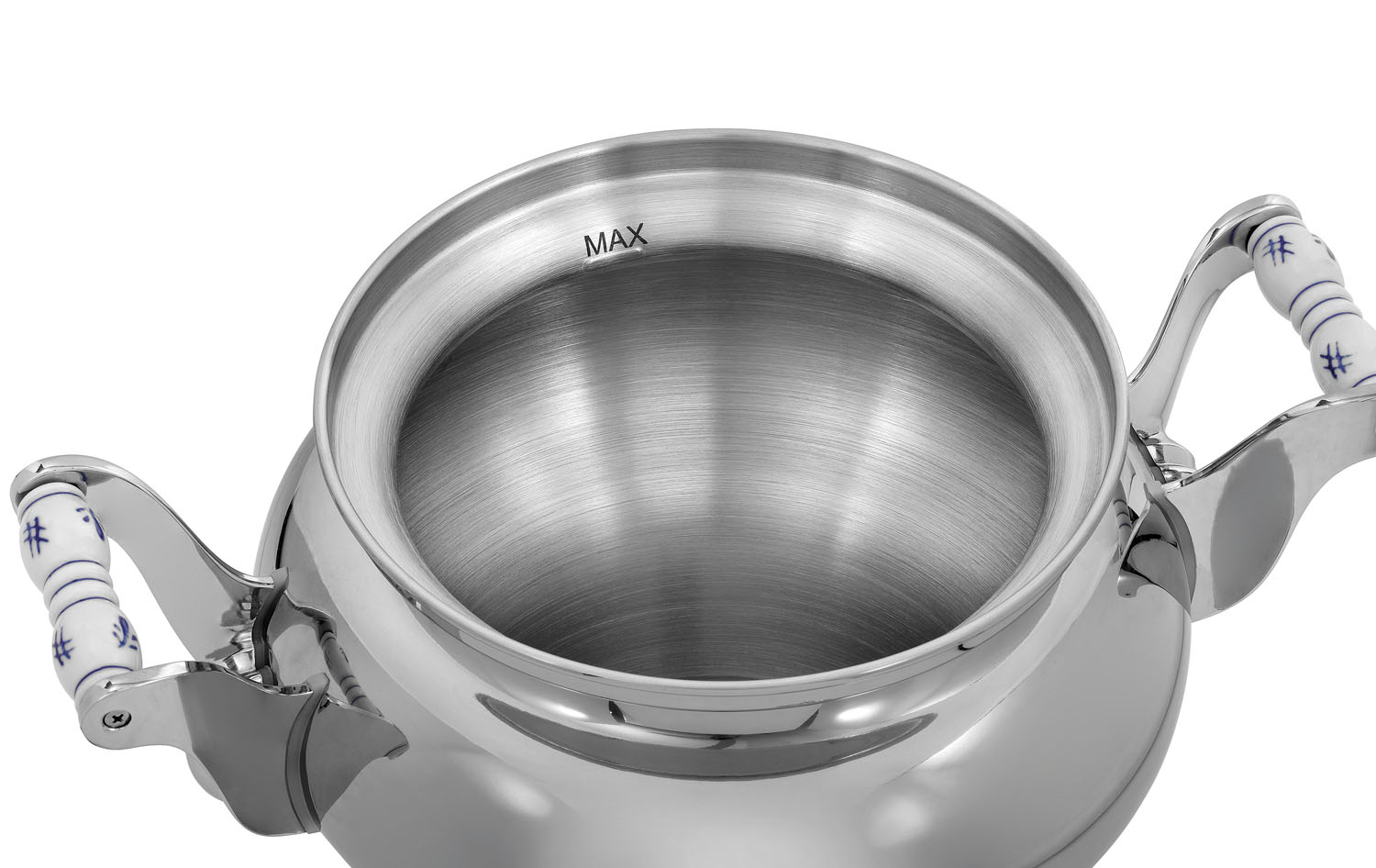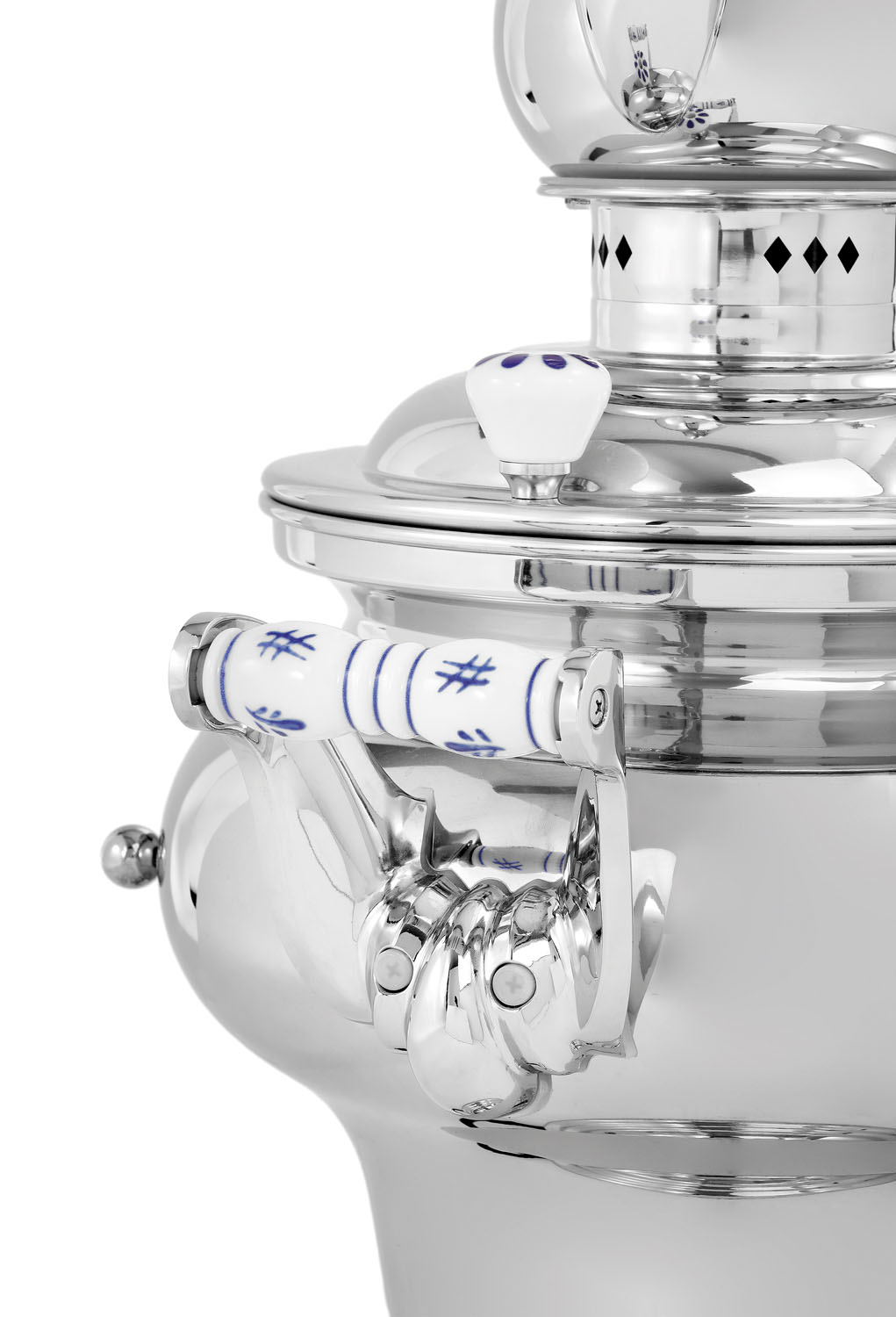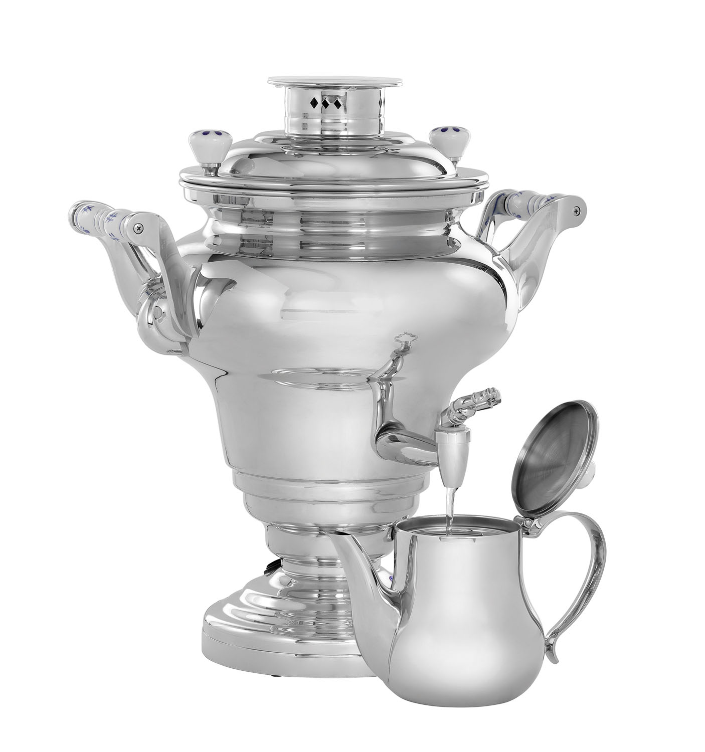 Der Samowar sticht insbesondere durch sein großes Fassungsvermögen von 15 Litern, der hohen Energieeffizienz und dem klassischen Design mit verzierten Keramikgriffen hervor. Bis zu 2 Liter Tee lassen sich in der Teekanne mit Teesieb aufgießen.