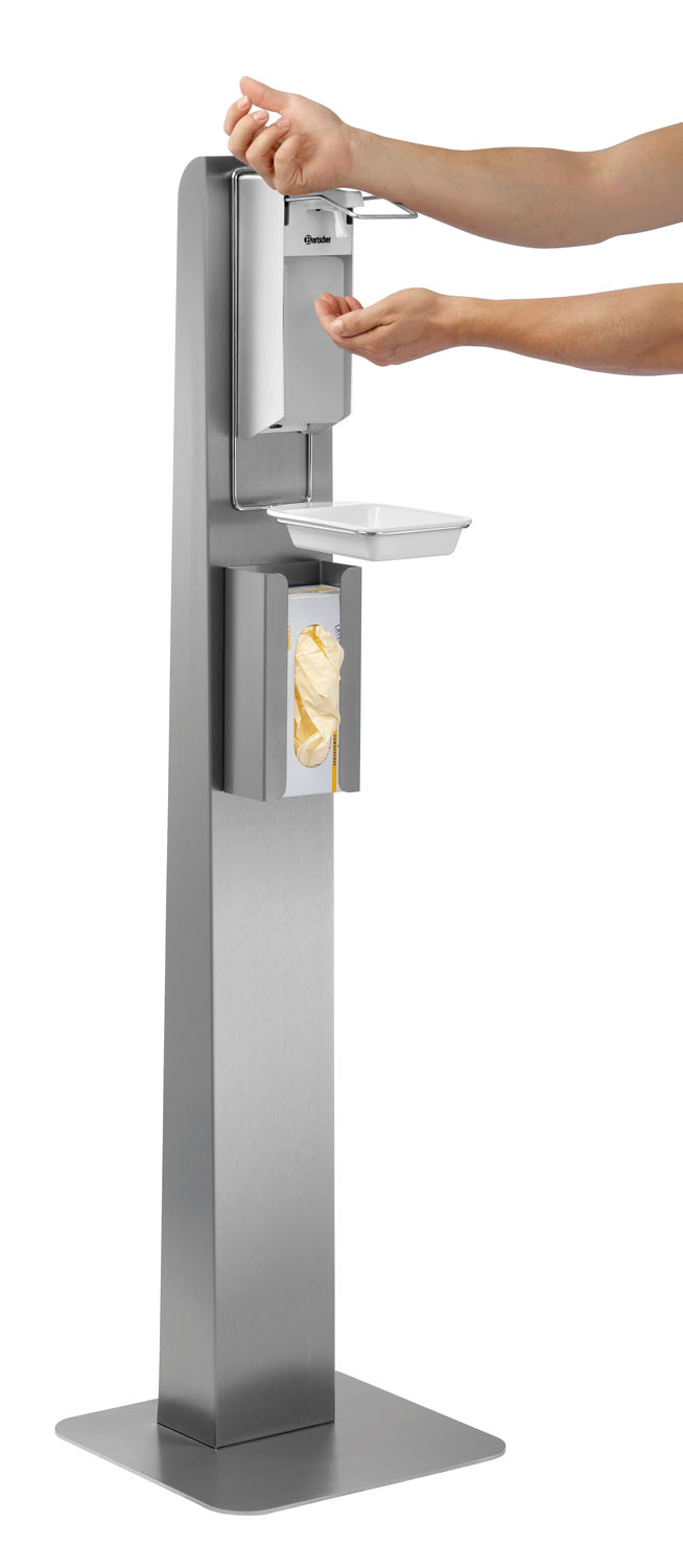 Das mobile Hygiene-Komplett-Paket: Desinfektionsspender, Abtropfschale, Handschuhspender und Hygienesäule in einem Set. Dank der soliden Edelstahl-Ausführung kann das Set ganz nach Bedarf und ohne Befestigung überall auf ebenen Flächen zum Einsatz kommen.
