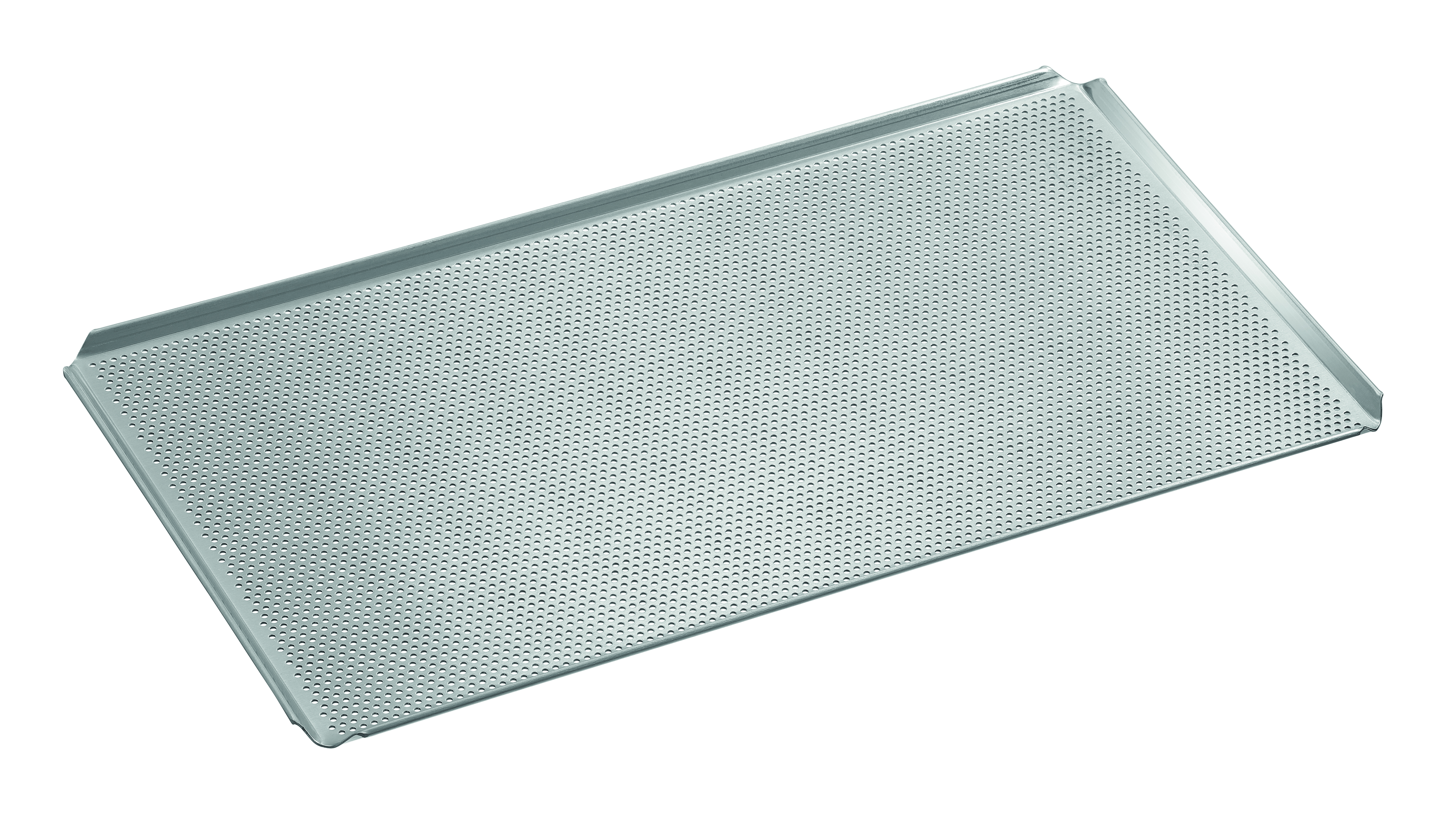 Das Lochblech aus Aluminium im 1/1 GN-Format ist temperaturbeständig bis 260 °C. Der 4-seitige Rand ermöglicht ein sicheres Backen und Transportieren.