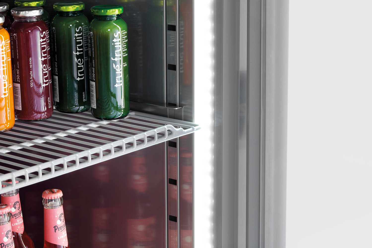 Solide Edelstahlausführung im ansprechenden Design, in Aluminium gerahmte Glastüren und eine hochwertige LED-Beleuchtung sind beste Voraussetzungen für eine perfekte Warenpräsenta…