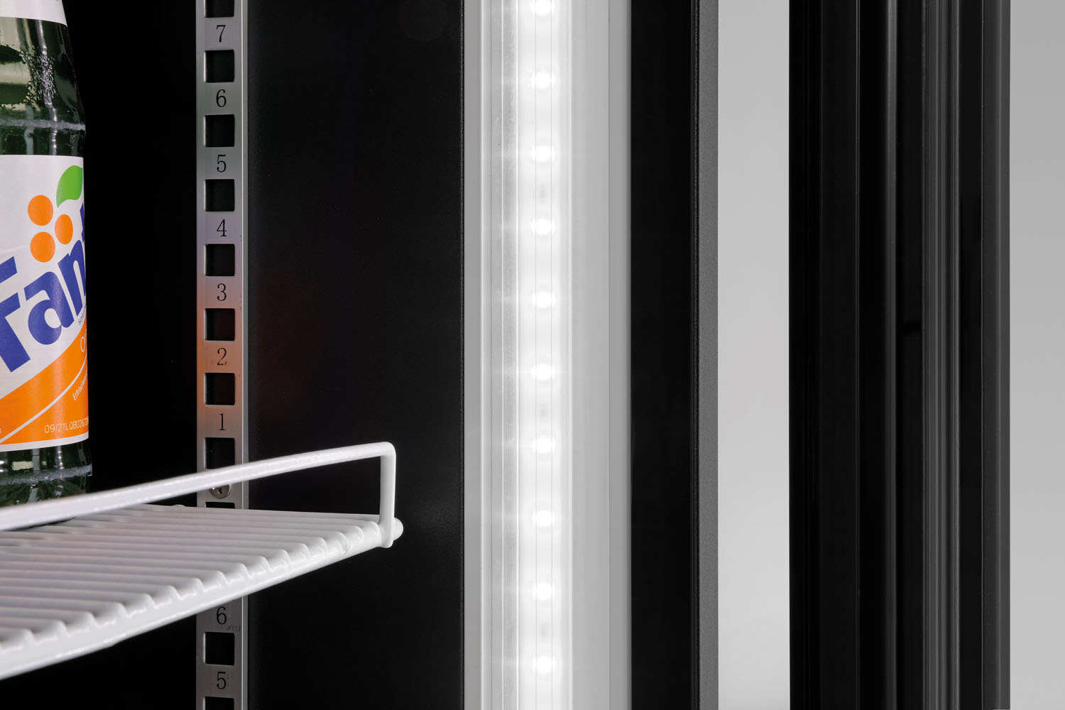 Schwarz, schmal, elegant – Ein besonderes Design, das sofort hervorsticht. Speisen und Getränke wirken in diesem Kühlschrank mit Glastür und LED-Beleuchtung direkt ansprechender und hochwertiger.