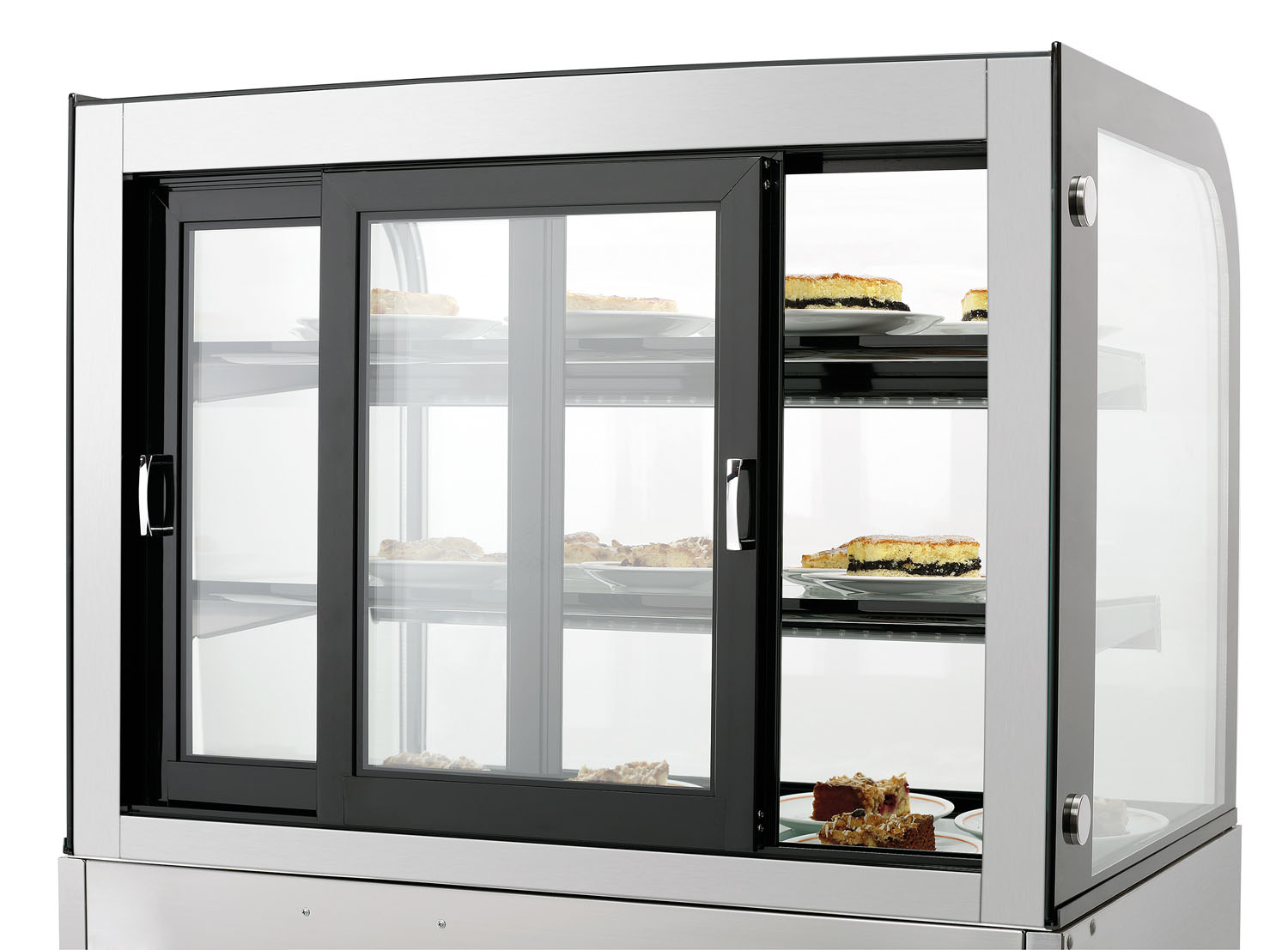 Die flexible Kühlvitrine für den Warenausgabebereich – Die höhenverstellbaren Zwischenablagen mit Preisschienen bieten repräsentative Stellflächen für gekühlte Getränke, Snacks und Speisen.