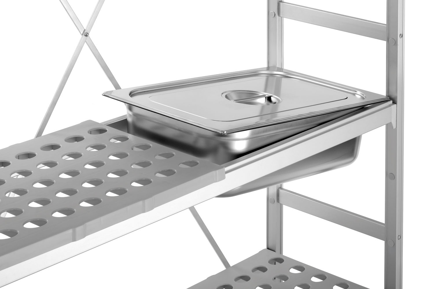 Das Regal ist nicht nur in allen Gastronomie-Bereichen einsetzbar, es ist zudem besonders vielseitig: Anstatt Regalböden können wahlweise GN-Behälter genutzt werden.