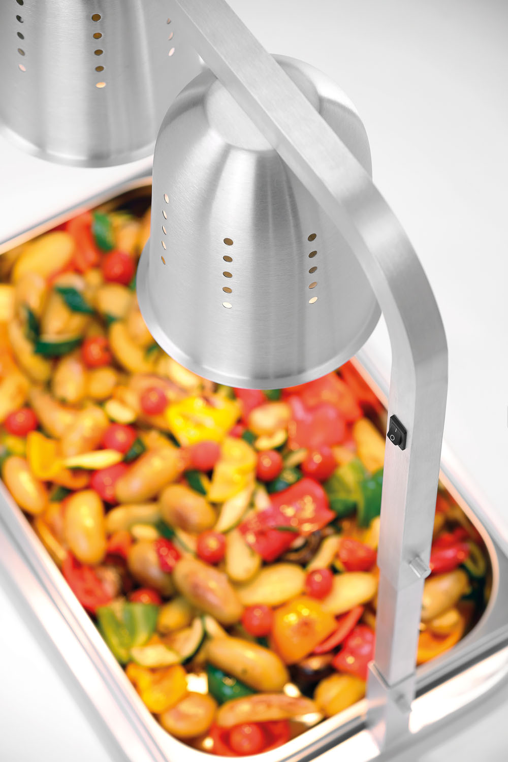 Ob an Buffets, bei Caterings oder in Kantinen – Die beiden Wärmelampen mit belüfteten Aluminiumreflektoren sorgen für eine zielgerichtete Wärmeabgabe. So können Speisen in Behältern mit einer Größe von bis zu 1/1 GN warmgehalten werden.