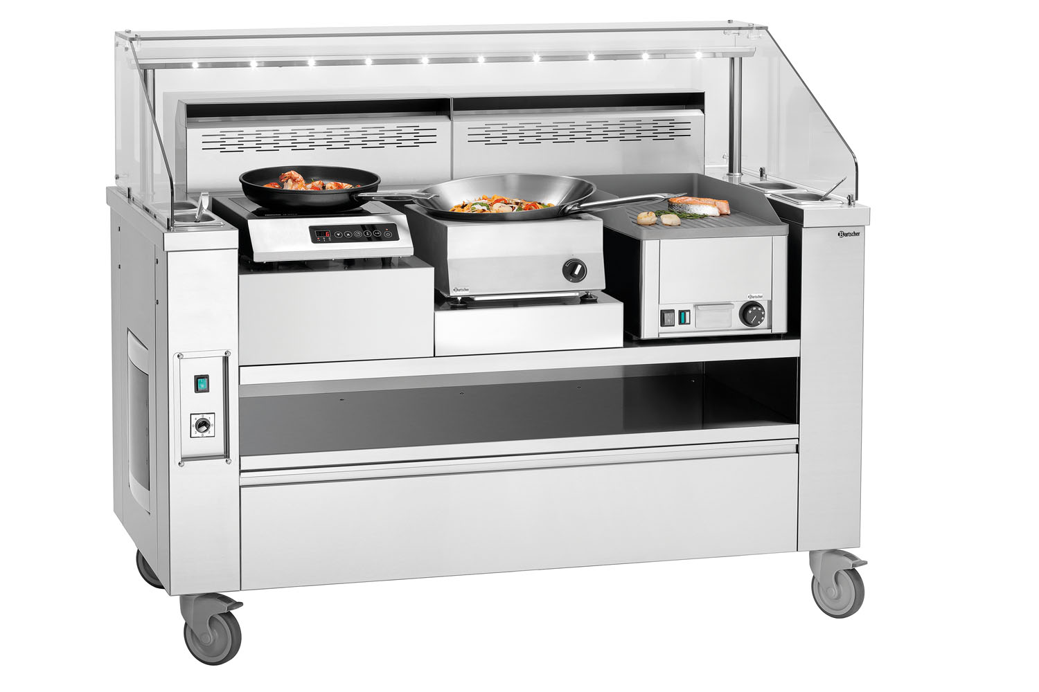 Optimierte mobile Kochstation für einen professionellen Auftritt im Front-Cooking-Bereich. Vom Induktionskocher mit 230 V bis hin zur soliden Griddleplatte der Serie 650 mit 400 V – Mit bis zu 3 Auftischgeräten extrem flexibel im Catering-, Event- und Front-Cooking-Bereich.