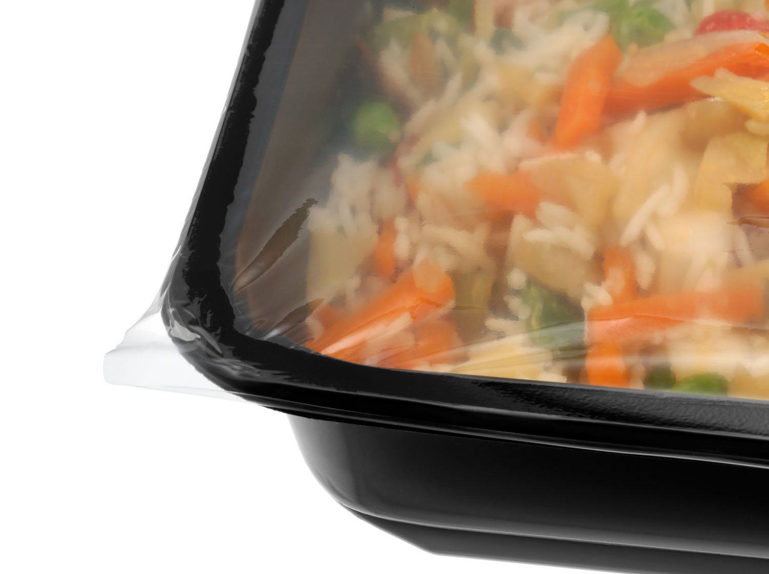 Egal ob warm oder kalt, alles bleibt an seinem Platz – Die ungeteilte Menüschale wird in der Siegelmaschine so gut verschlossen, dass weder feste noch flüssige Speisen auslaufen können.