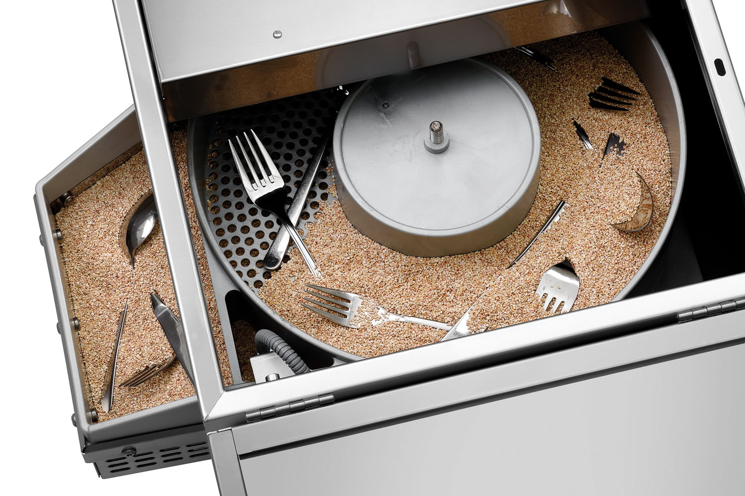 Besteck auf Hochglanz poliert – Bis zu 1.500 Besteckteile pro Stunde. Dank der integrierten UV-Lampe und der HACCP-konformen Betriebstemperatur sind die Besteckteile hygienisch fr…