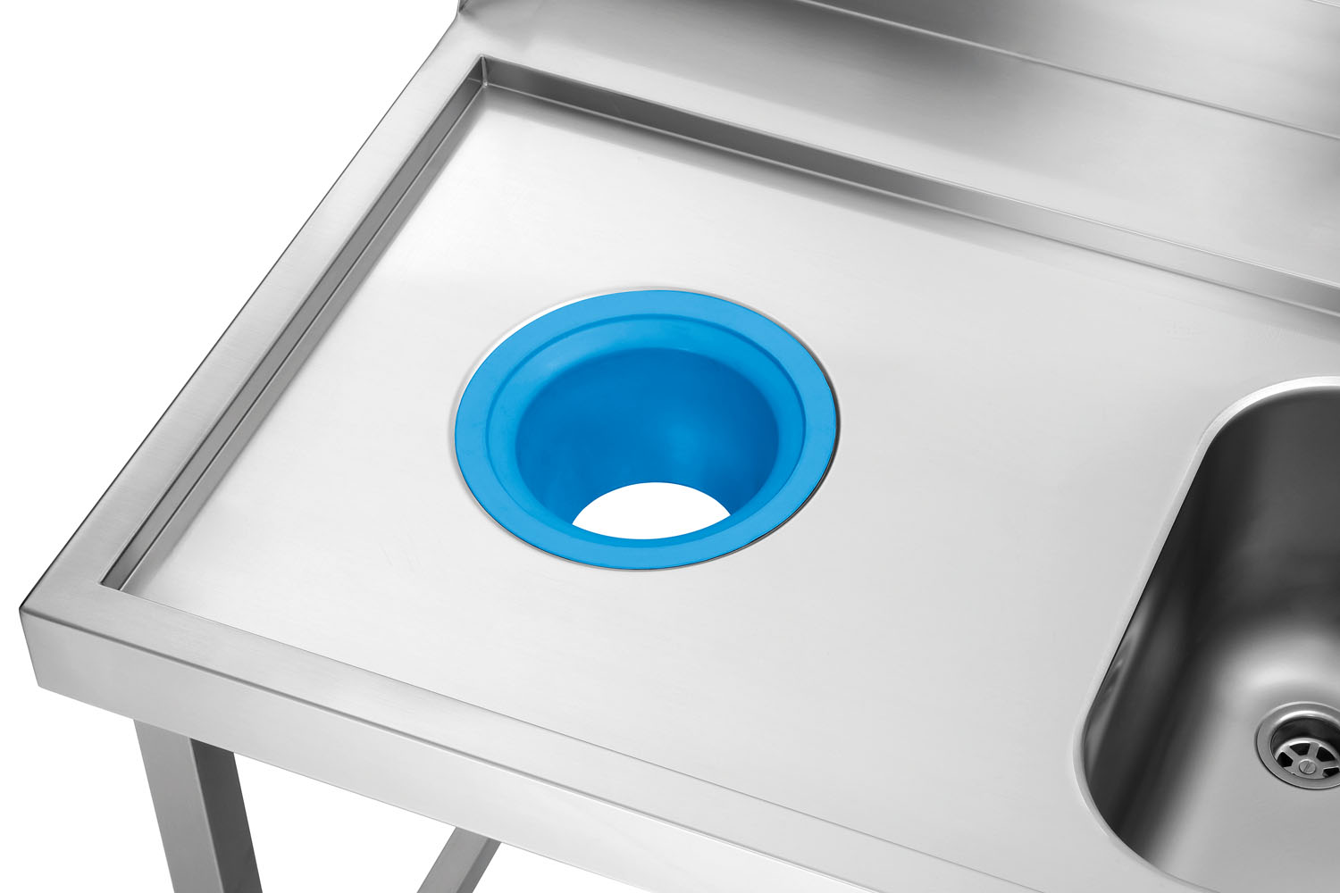 Die 1,2 m breite Vorabräumung mit Spüle und Abfallschacht ist ausgelegt für den linksseitigen Anbau an die Bartscher Durchschubspülmaschinen DS. Ein Grundboden bietet Abstellfläche für Spülkörbe.
