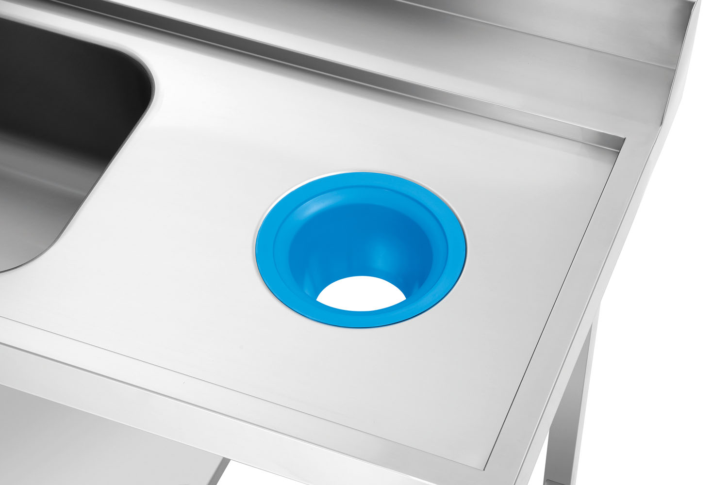 Die 1,2 m breite Vorabräumung mit Spüle und Abfallschacht ist ausgelegt für den rechtsseitigen Anbau an die Bartscher Durchschubspülmaschinen DS. Ein Grundboden bietet Abstellfläche für Spülkörbe.