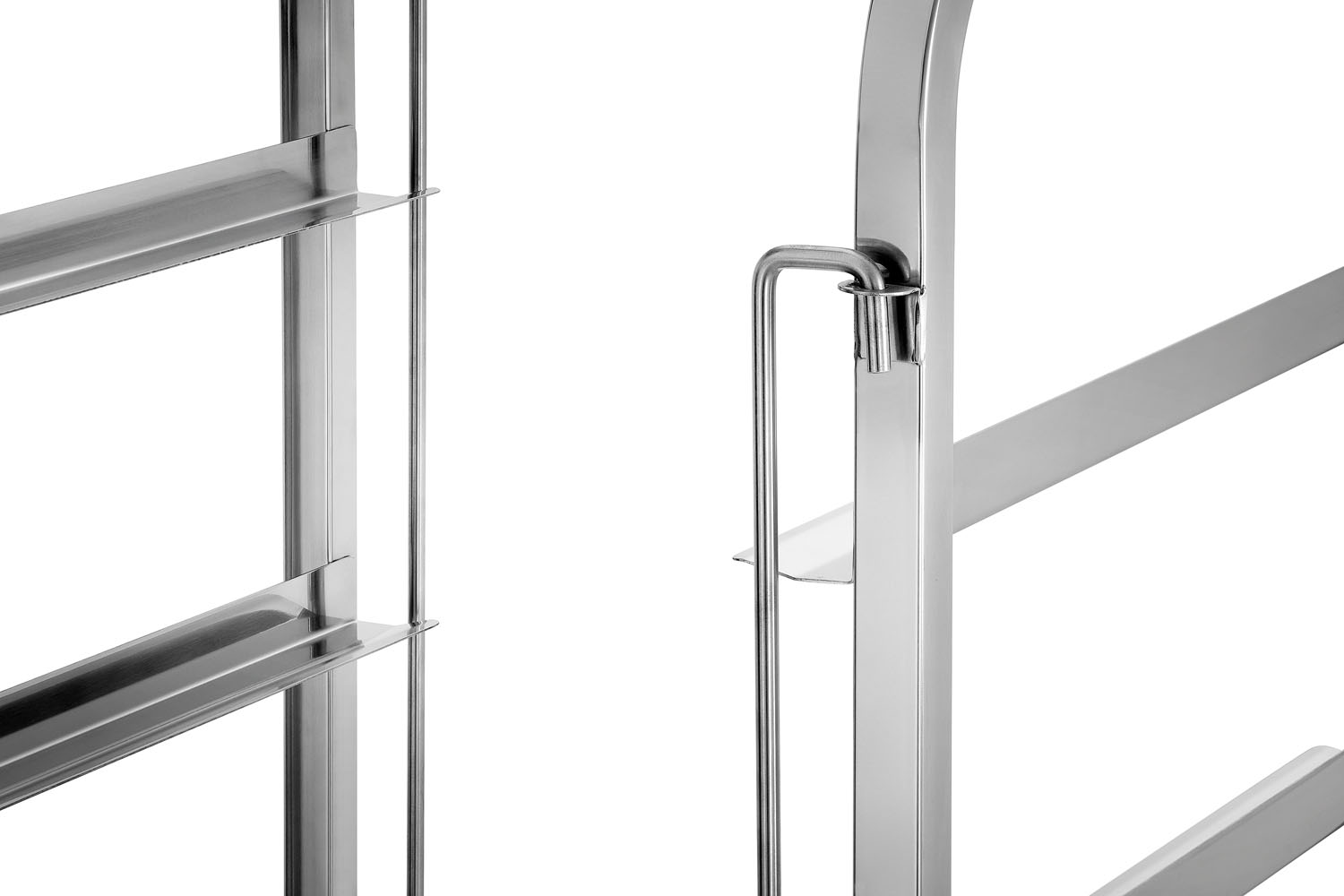Mit 7 Einschüben bietet der beidseitig bestückbare Spülkorbwagen platzsparende Stau- und Abräumfläche. Die Korbsicherung verhindert ein Verrutschen, Kippen oder Herausfallen der Spülkörbe.
