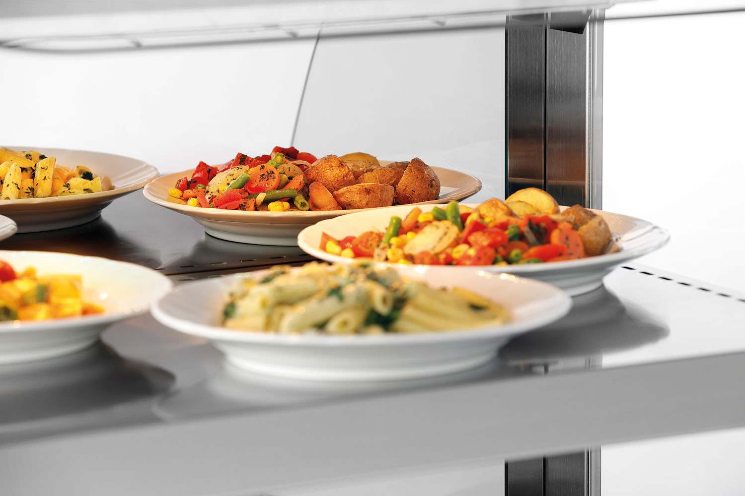 Mit der heißen Theke können Speisen auf zwei Ebenen platzsparend warm gehalten werden. Lampen zur Ausleuchtung der Stellflächen, sowie ein an der Rückseite angebrachter Spiegel sorgen für eine ansprechende Präsentation der Speisen.