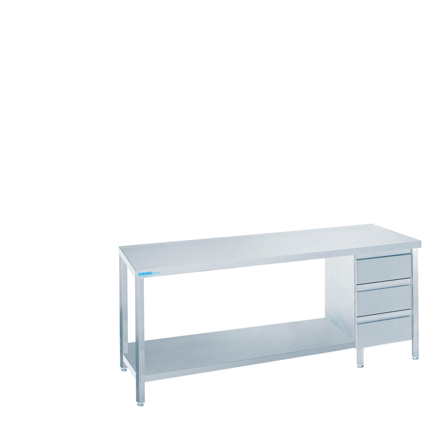 Tischplatte (50 mm) aus CNS 18/10, schalldämmend unterfüttert und mit umlaufendem Profil verstärkt. Mit Aufkantung 50 mm hinten (C) oder allseits abgekantet (A). Unterbau offen aus CNS 18/10, mit einem fest eingeschweißten Boden. Links ein Schubladenblock mit 3 Kastenschubladen (GN 2/3), mit integrierter Griffleiste, Auszüge aus Edelstahl, Nutzhöhe je 150 mm. Fußhöhe 150 mm. Arbeitshöhe 850- 900 mm, variabel einstellbar. Niveauausgleich von -5 / +10 mm möglich.