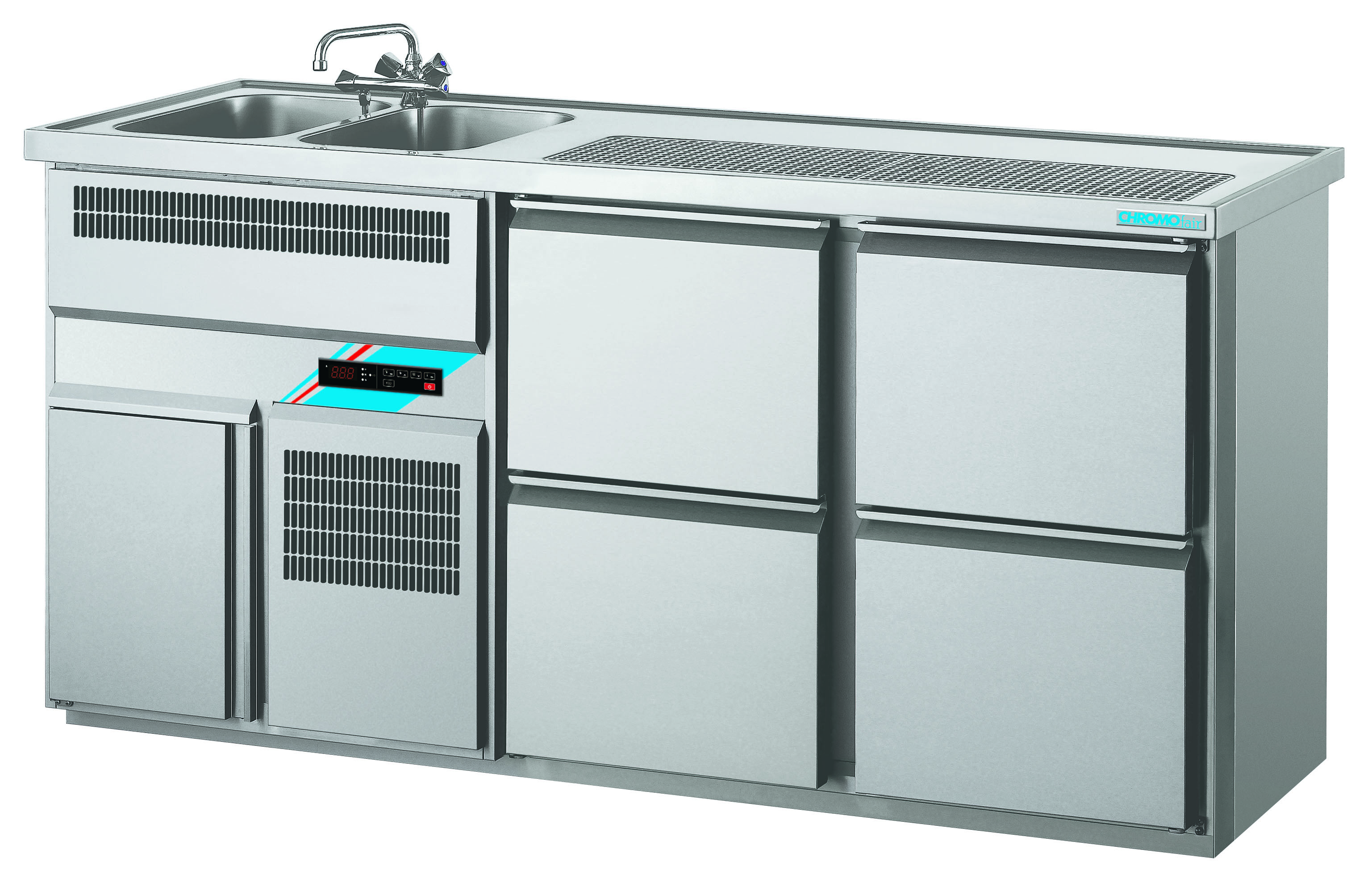 CHROMOnorm - Made in Germany. Energiesparend, Getränketheke 2 Becken + 4 Laden 1/2, Volledelstahl, CHROMOfair , 197 kg, 195 x 70 x 98 cm, +2° / +12°C, Umluftkühlung, elektr. Regler, Becken links, autom. Abtauung, Tauwas
