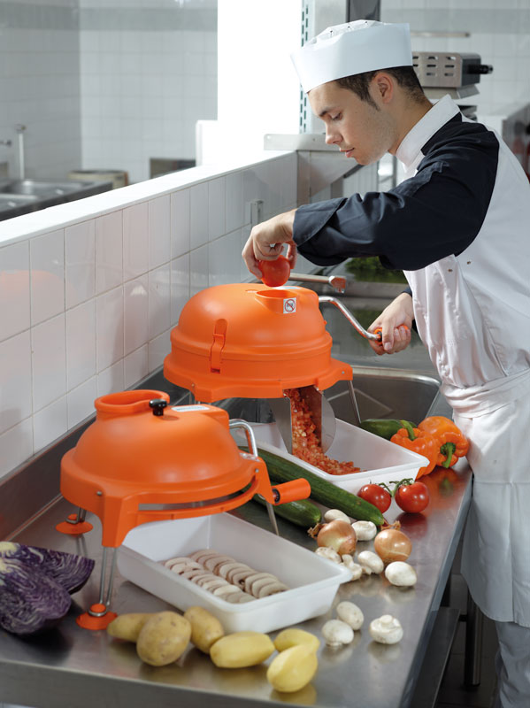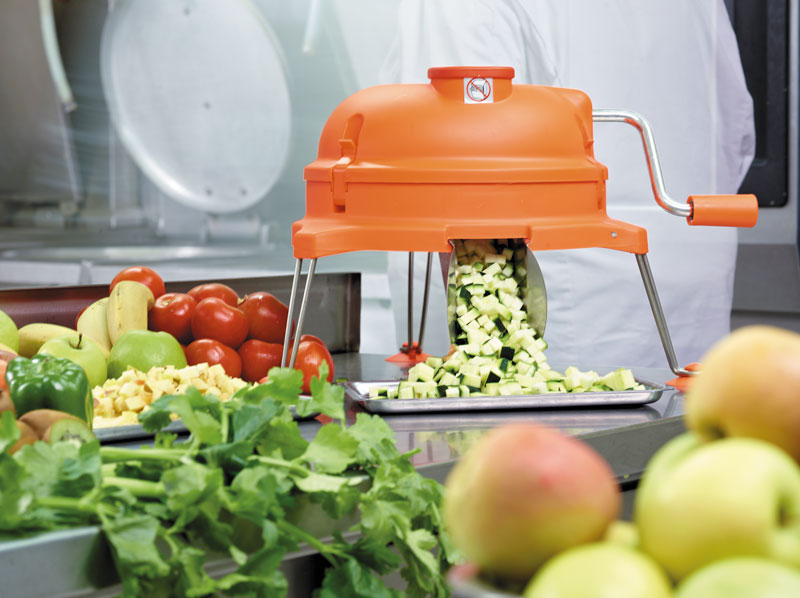 Produkte wie Gemüse,Obst, Käse oder gekochtes Fleisch, selbst Tomaten werden schonend und perfekt geschnitten oder gewürfelt.