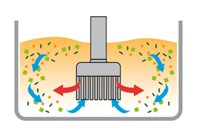 Die Masse wird von unten angezogenund mit dem Emulgierwerkzeugzerschnitten und zerkleinert.Dann mit hoher Geschwindigkeitdurch die Zähne der Glocke ausgestoßen."