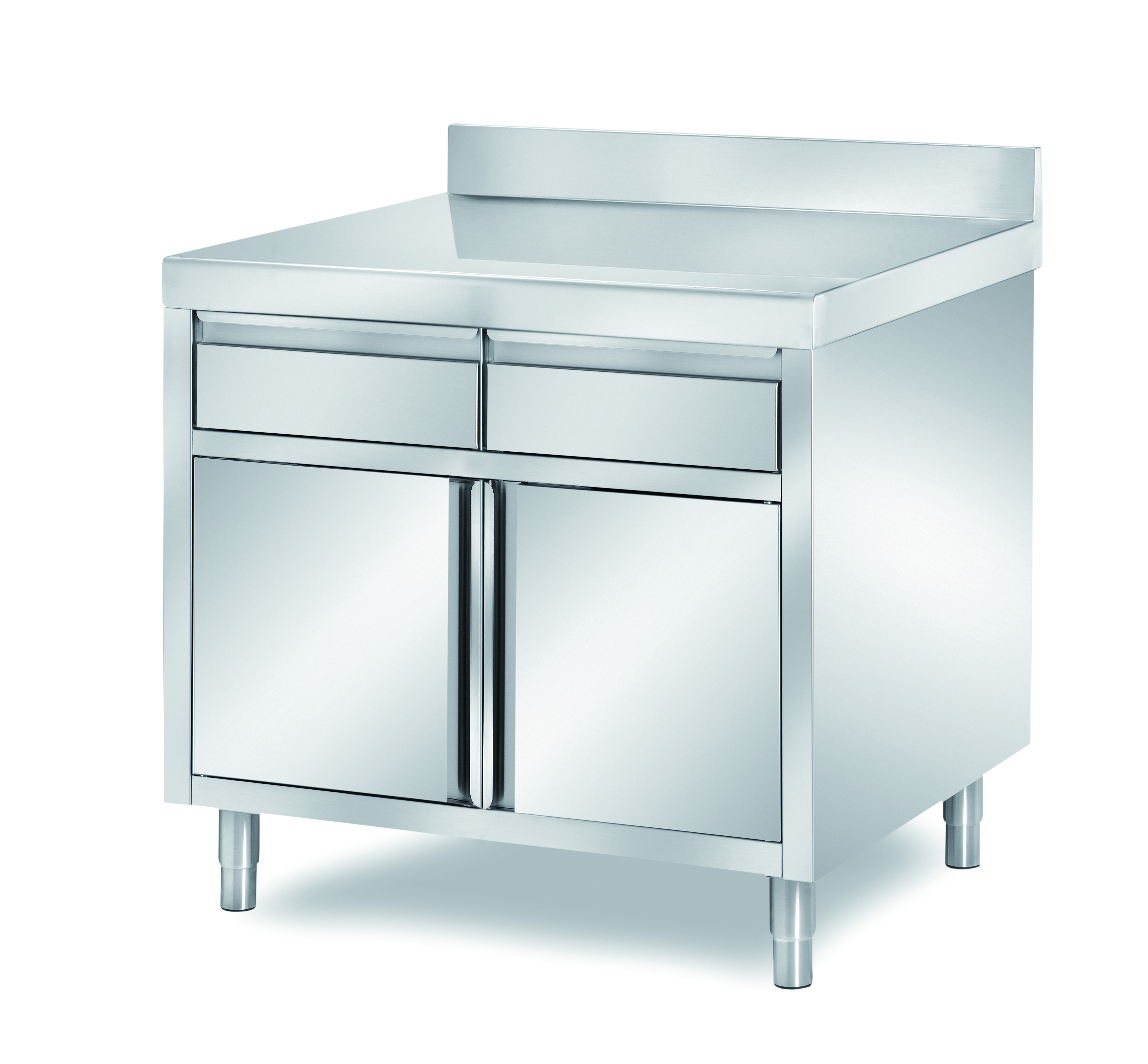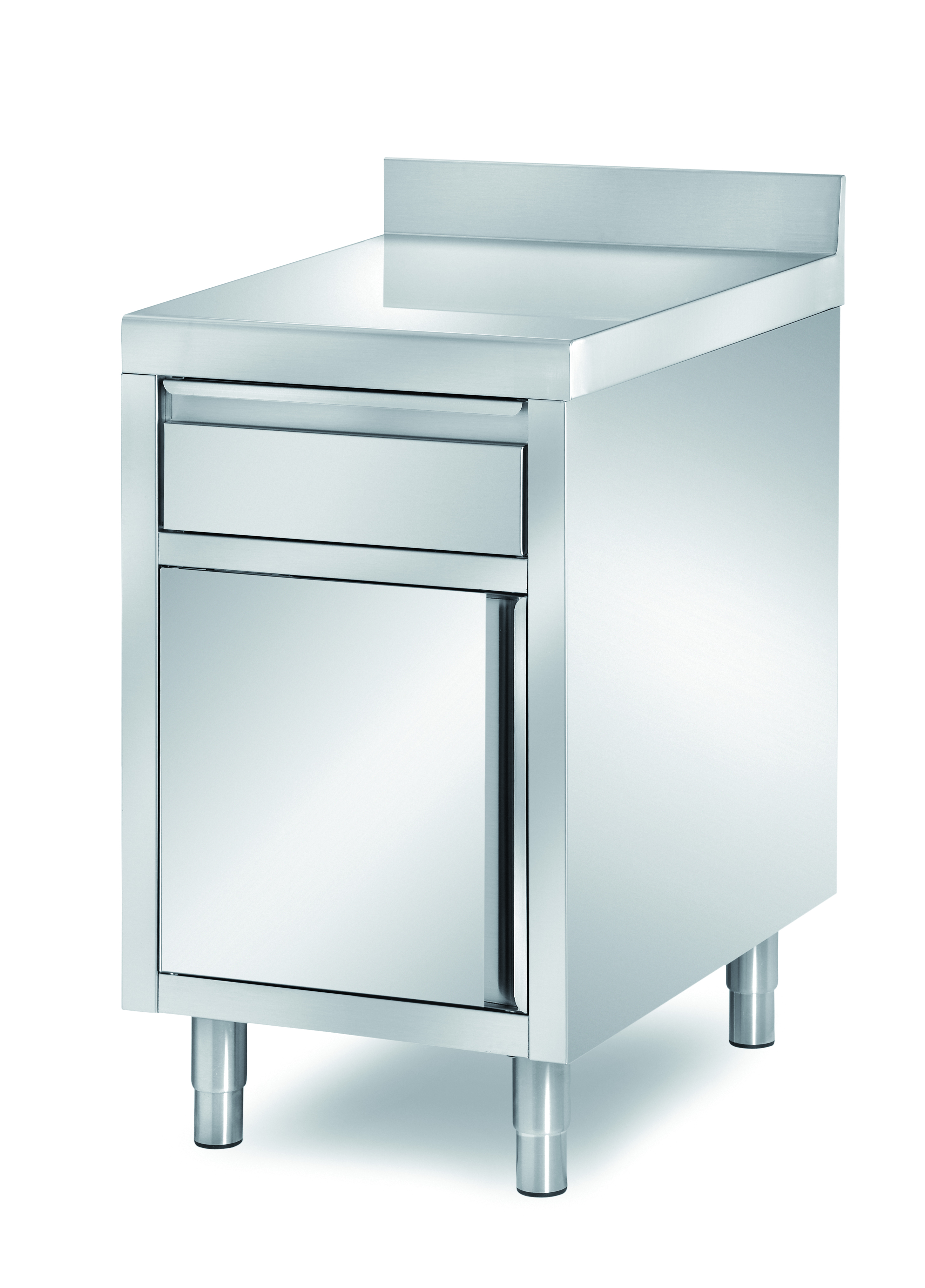GastroXtrem Edelstahl-Unterbauelemente und Unterbaumodule mit Schublade und zusätzlichem Schrankfach mit Flügeltür ohne Tischplatte, alle Unterbauelemente sind als Edelstahl Sonderbaumöbel auf Anfrage individuell lieferbar.