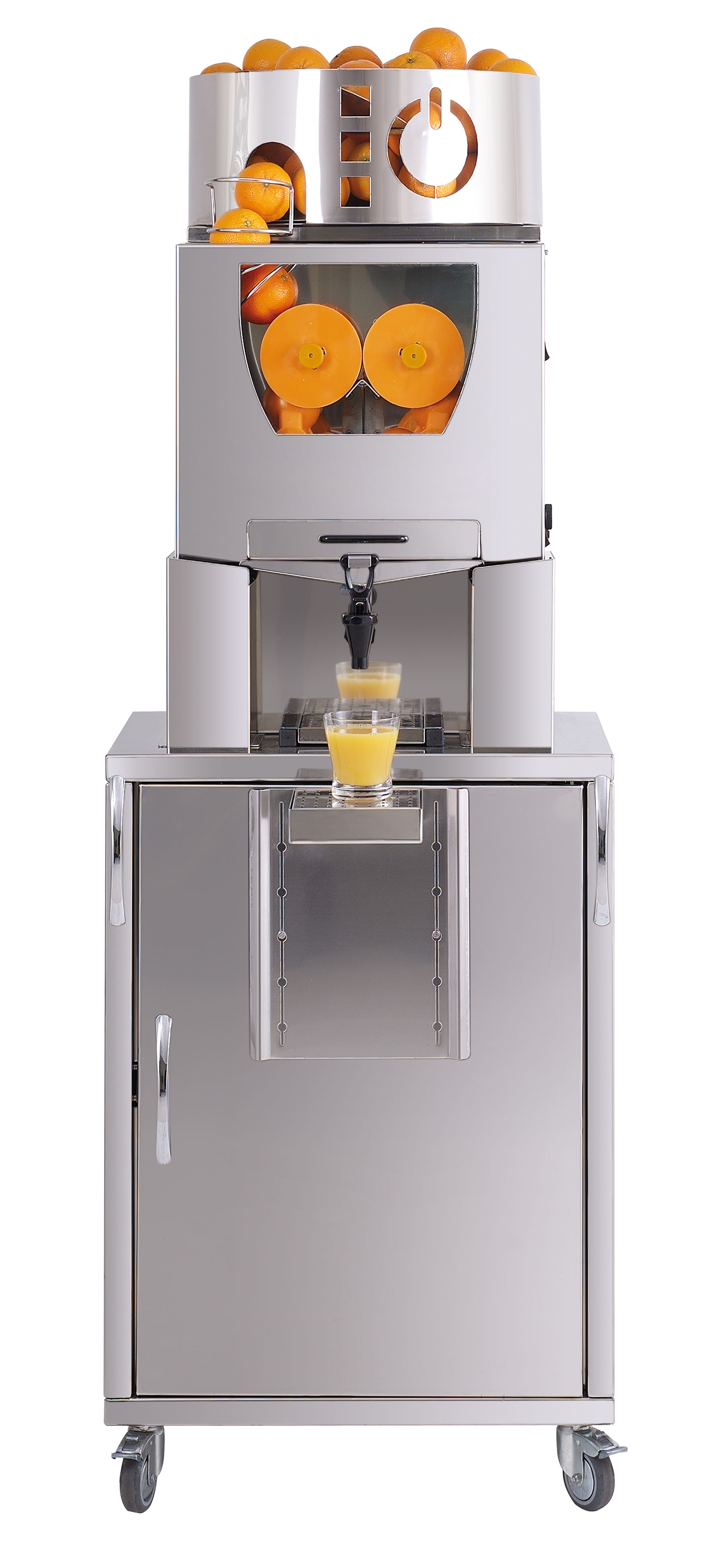 Kompakte SB-Lösung für das Abfüllen von frisch gepressten Orangensaft: Selbstbedienung für Ihre Kunden. Ideal für Lebensmittelmärkte • Automatisches Starten und Stoppen des Entsaftens durch Bedinung des Zapfhahns • Unterbau für Abfalleimer • Durch Abfallschächte werden die Schalen der gepressten Orangen in den Unterbau geführt • Platzsparend und sauber • Gehäuse Edelstahl • Vorratsbehälter für ca. 12 kg Orangen • automatische Abschaltsensoren • Orangen-Ø bis 80 mm • optionales Flaschenregal nicht im Lieferumfang enthalten