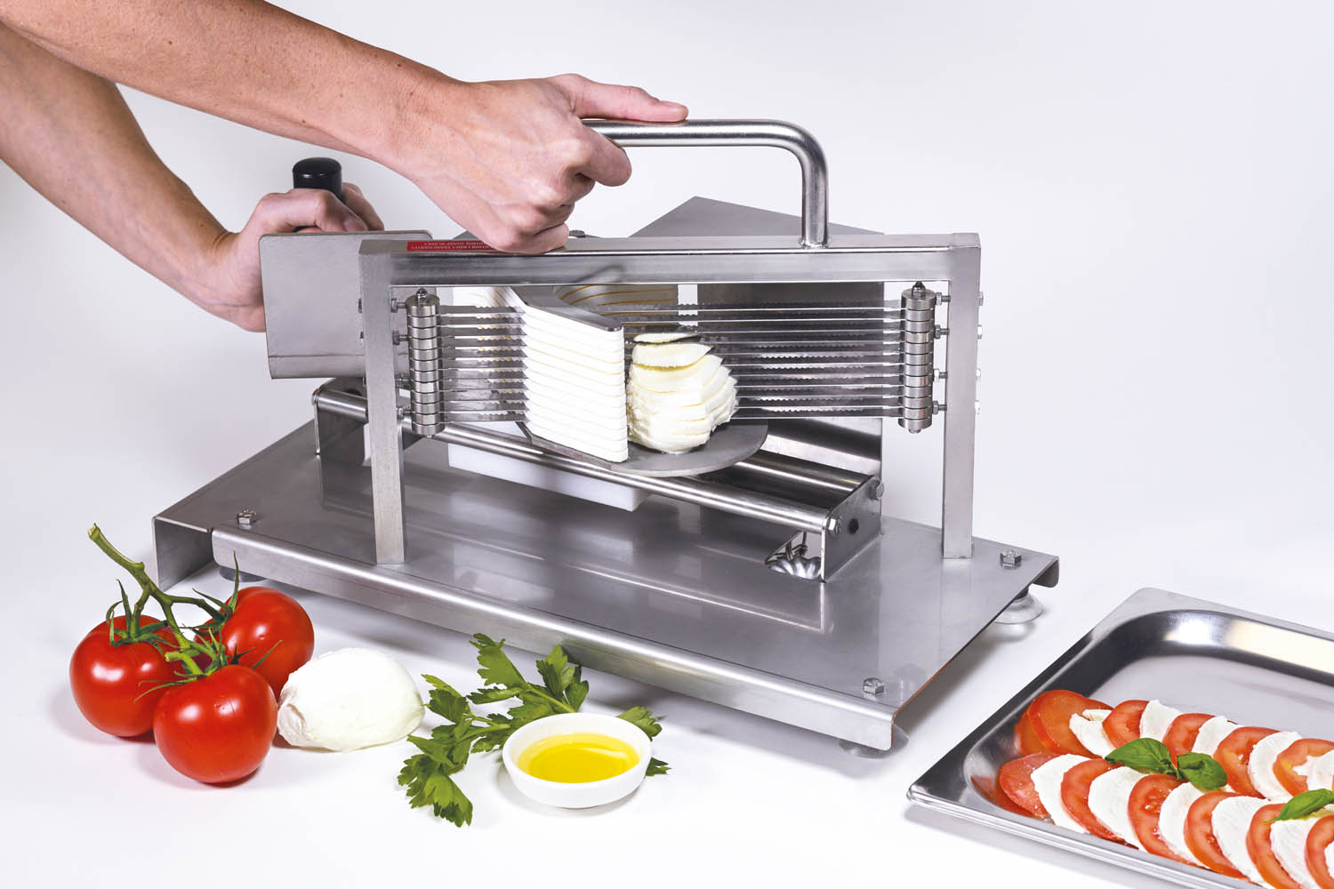 Für das Schneiden von Mozzarella und Tomaten in gleichmäßig dicke Scheiben • Das ideale Werkzeug für die regelmäßige Zubereitung von Caprese • Edelstahl • Stabile Konstruktion von Rahmen und Führungsschienen • Spezialmesser mit besonders scharfem Zahnschliff und Drücker optimiert für das Schneiden von Tomaten und Mozzarella • Messersatz auswechselbar • Schnittdicke 5,5 mm • Erhöhter Auswurf: Tomaten können direkt in einen 65 mm tiefen GN-Behälter ausgeworfen werden • Für die Reinigung im Geschirrspüler geeignet