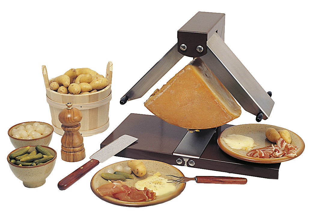 Dieses Raclette-Zubereitungssystem von Neumärker mit beweglichen Schenkeln passt sich der Käsekontur an und ist optimal auf Partys für die Zubereitung von leckeren Schmelzkäse-Variationen.