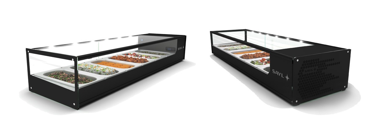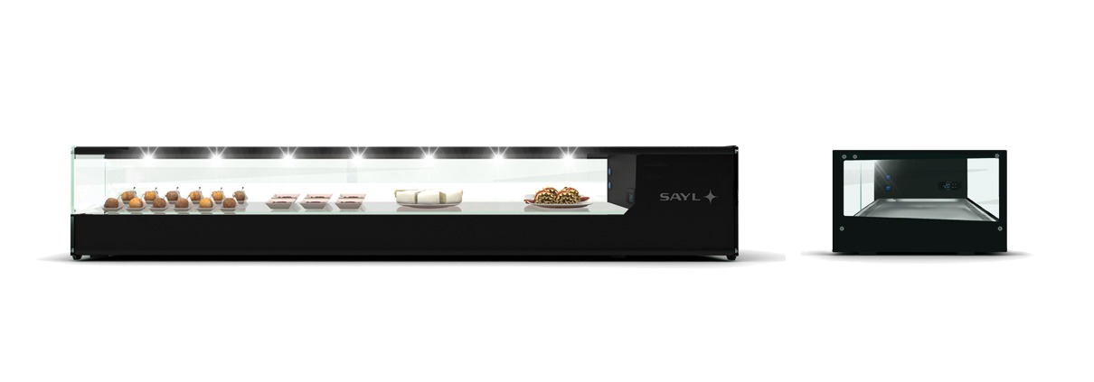 In unserem Online Shop kaufen Sie diese hochwertige Tapas-Vitrine als Kühlaufsatz-Vitrine. Der Kühlaufsatz hat eine Kapazität von 6 x GN 1/3. Optimal zur Präsentation von Tapas - Menus.