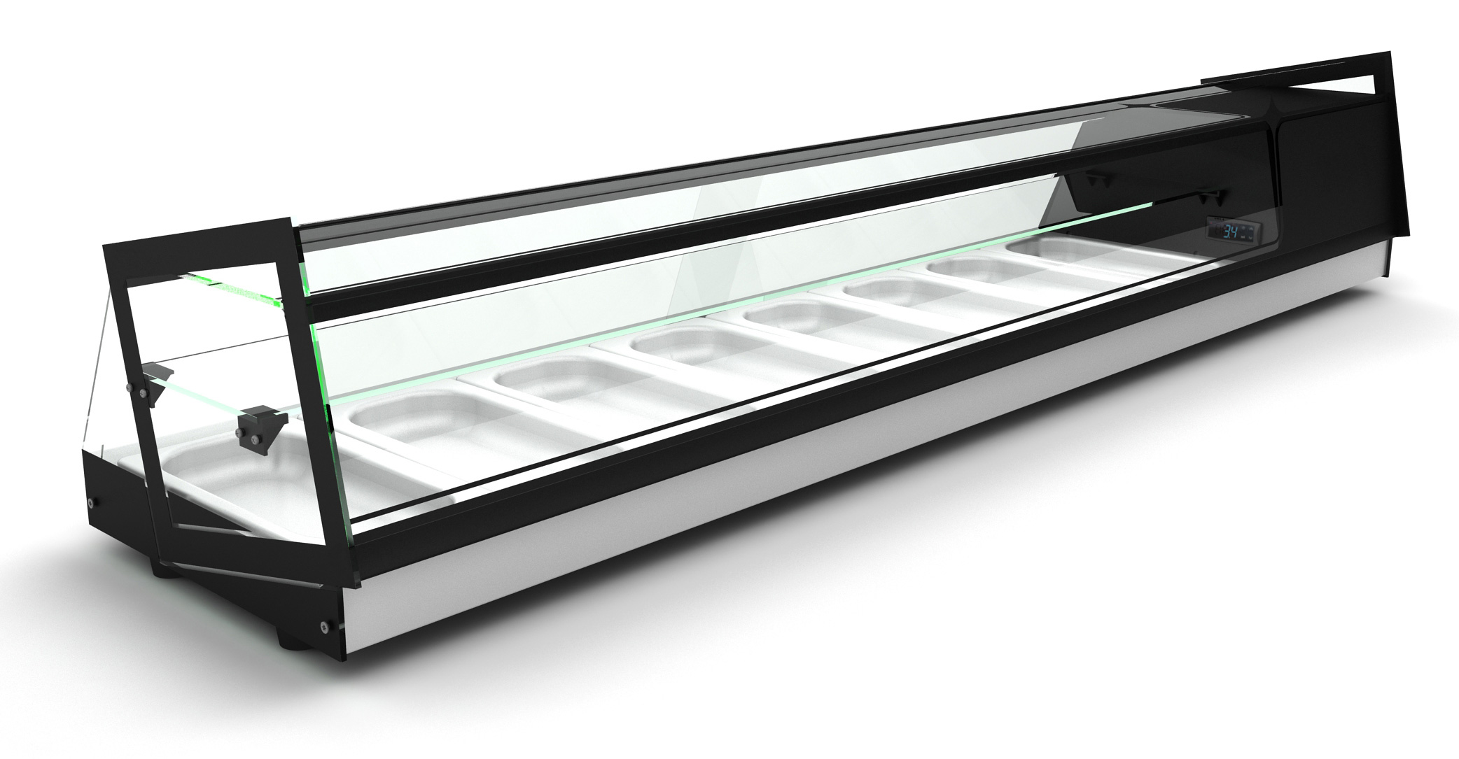 Diese Kühl-Vitrine Cube der Fa Neumärker bietet Raum für 8 x GN 1/3 Behälter. Als Aufsatz für die Zutatenentnahme für Döner, Pizza oder Hamburger eignet sich diese Kühl-Vitrine optimal für den professionelle Gastronomiegebrauch.