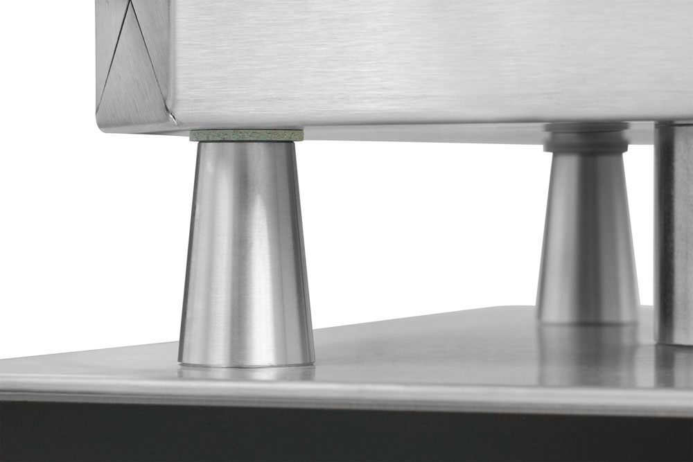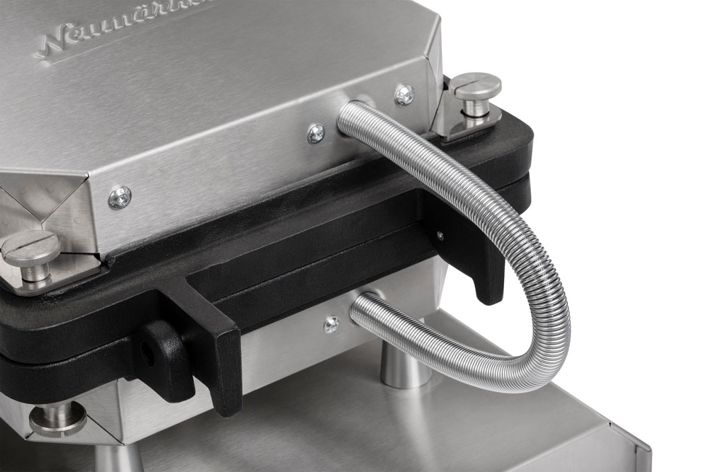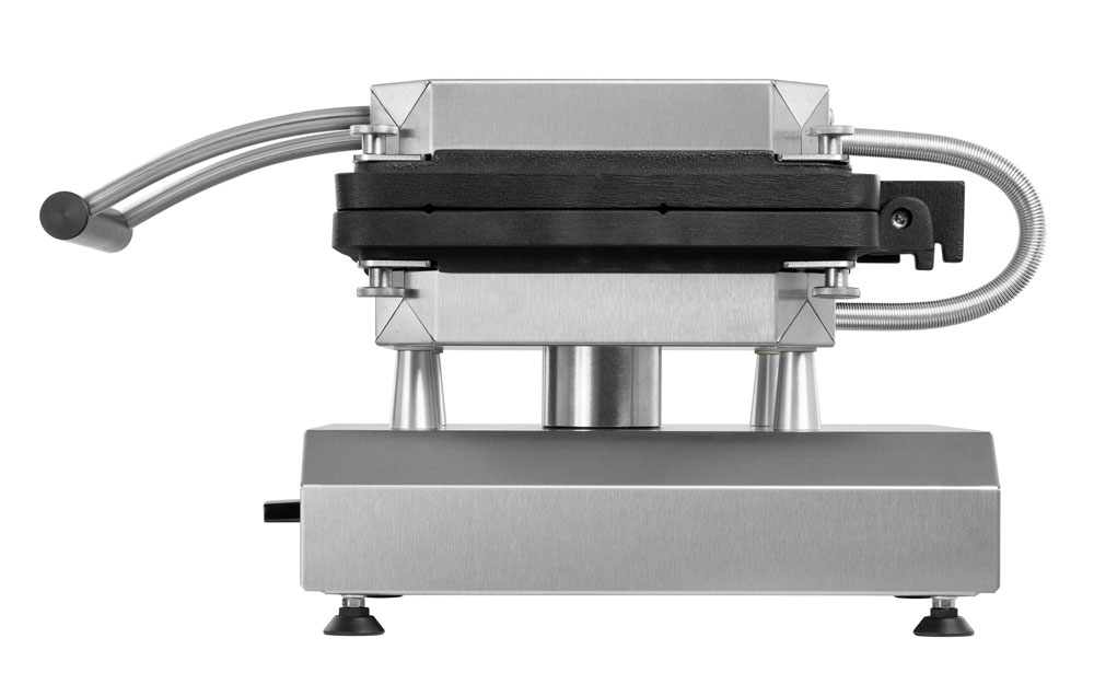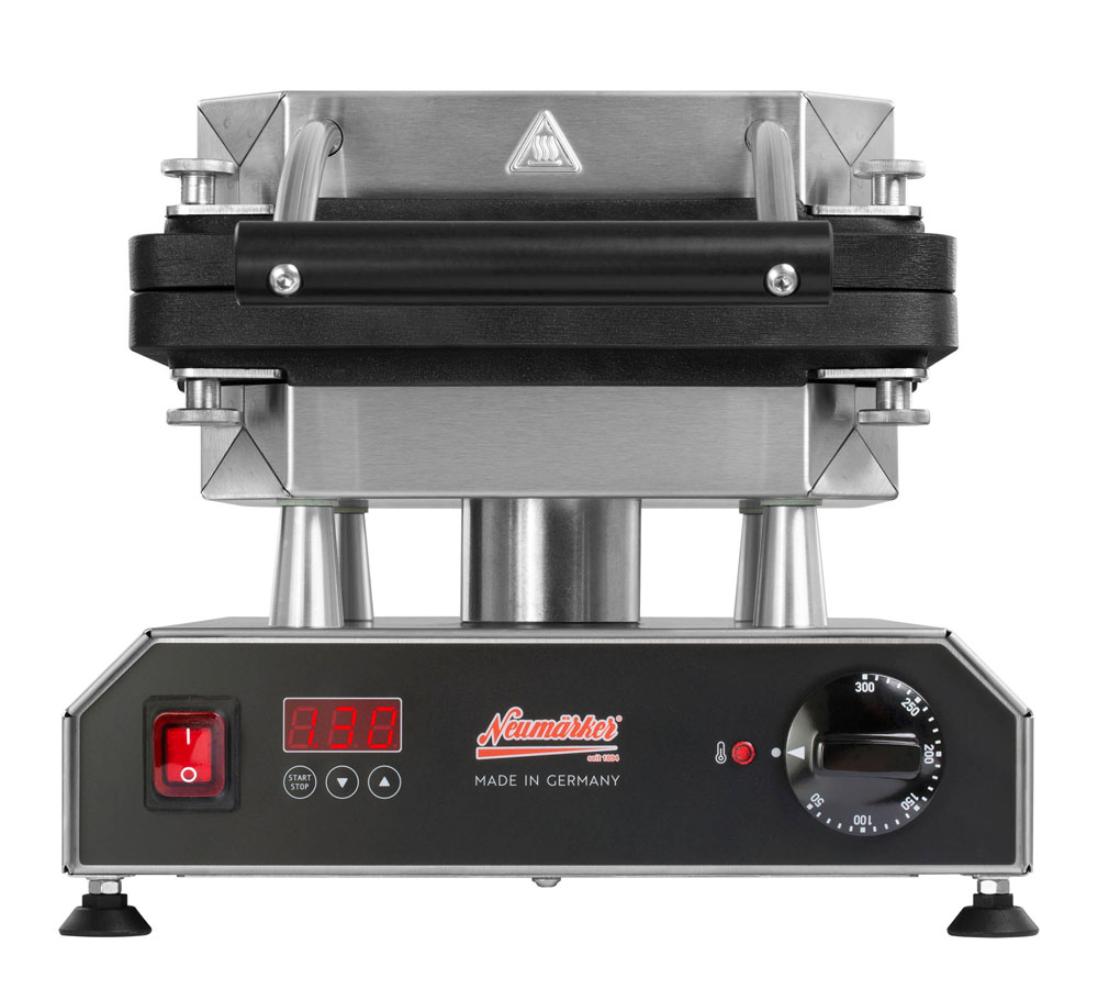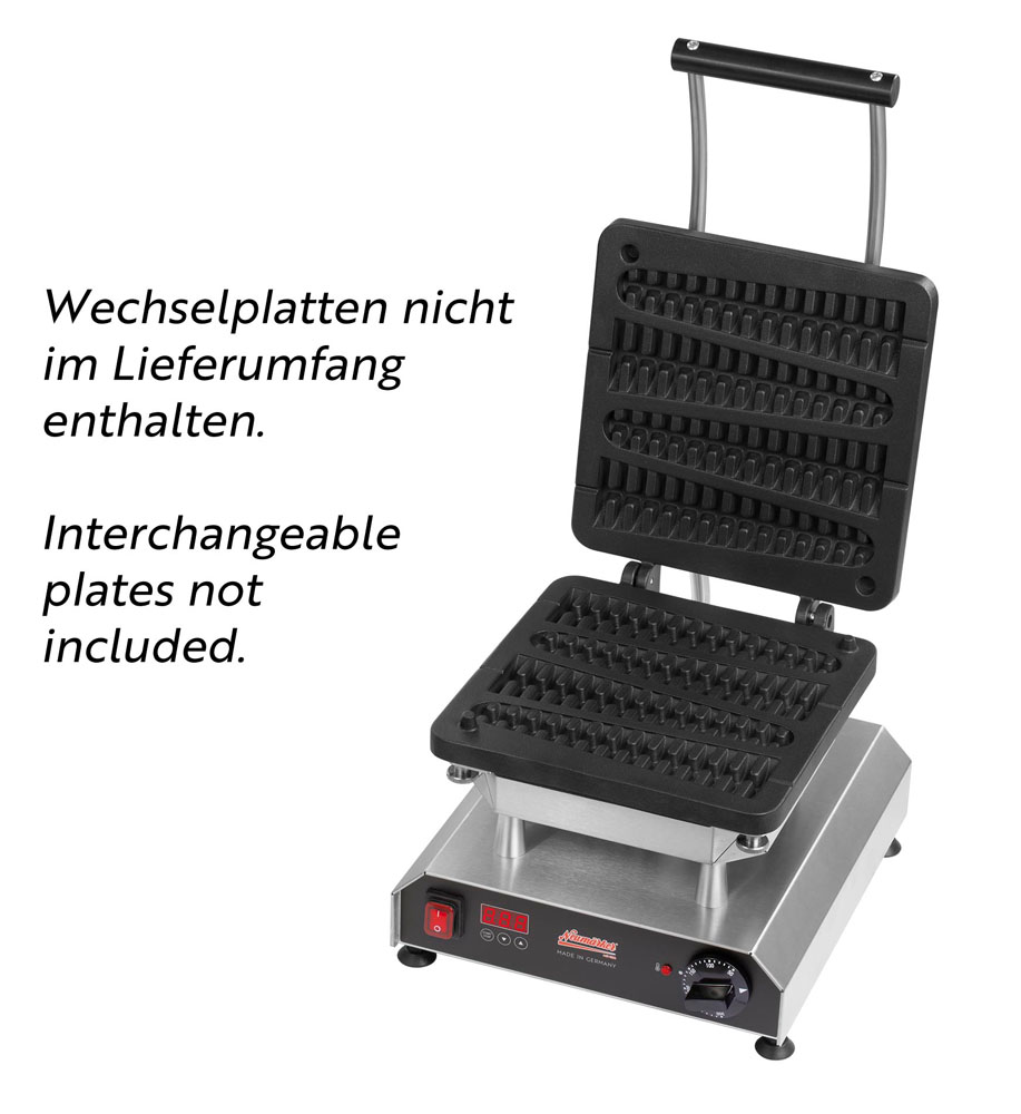 Multifunktionsgerät für auswechselbare Platten (nicht im Lieferumfang enthalten) • Aktuell über 25 verschiedene Wechselplatten erhältlich, z.B. für Waffeln, Pizza, Crêpes, Paninis, Pancakes, Donuts, Sandwiches, Churros u.v.m • Digitaltimer mit großem Display einstellbar bis 9:59 Min/Sek • Ein Signalton am Ende der Zubereitungszeit gewährleistet beständige Produktqualität, auch bei wechselndem Personal • Durch das akustische Signal wird der Anwender zum richtigen Zeitpunkt daran erinnert, die Speisen zu entnehmen, so dass diese nicht anbrennen, während er parallel anderen Tätigkeiten nachkommt • Optimale Hitzeübertragung: Direkter Kontakt zwischen Heizkörper zur Wechselplatte durch 8 Schrauben, die gleichmäßig angezogen werden • Neue, leistungsstärkere Spezialheizkörper mit vergrößerter Heizfläche für eine gleichmäßige Wärmeübertragung ohne Hotspots • Besonders energieeffizient durch optimierte Wärmeisolierung: Eine doppelte Abschirmung minimiert Wärmeverluste und reduziert die Gefahr schwerer Verbrennungen • Äußerst stabile Rahmenkostruktion durch verstärkte Stützleisten • Der Abstand von 42 mm zwischen den heißen Platten und dem Gehäuse ermöglicht die thermische Entkopplung und verlängert somit die Lebenszeit des Produktes • Verbesserte Lüftungsschlitze gewährleisten den Wärmeaustausch im Gehäuse • Einfache Reinigung der leicht erreichbaren Oberflächen • Besonders servicefreundliche Konstruktion für eine einfache Wartung und Reparatur • Frontpanel mit Display aus pflegeleichtem und langlebigem Autotex Polyester • Thermostatische Regelung 0 - 300°C • Kontrollleuchte • Ein-/Ausschalter • Gehäuse Edelstahl • Höhenverstellbare Füße
