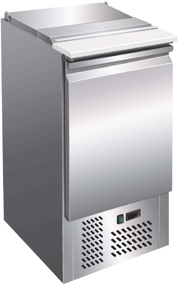 - Material: (Gehäuse und Innenraum) Edelstahl, - Klappdeckel, - Polyethylen-Schneidebrett, - 1 höhenverstellbares Rost und 1 Auflageschienen-Set, - Auf 3 Seiten eingeschäumter Verdampfer, - Statische Kühlung mit Umluftventilator, - Digitale Temperaturkontrolle (DIXELL), - Automatische Abtauung, - Kältemittel: R600a, - Gewicht: 62 kg, - Maße: B 435 x L 700 x H 870-890, - temp. +2 / +8 °C, - Anschluss: 230 V - 50 Hz - 0,23 kW