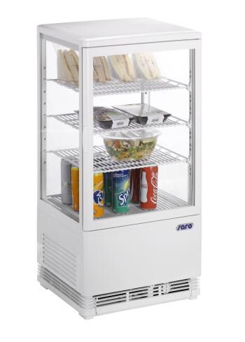 Mini-Umluftkühlvitrine, saro, Inhalt ca. 70 Liter, 42,7 x 38,4 x 88 cm, 37 kg, 3 verstellbare, kunststoffbeschichtete Roste, 4-seitig doppelverglast, Innenbeleuchtung, Temperaturbereicht: 2 bis 12 Grad, Zanussi Kompressor, automatische Abtauung