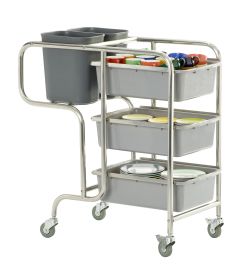 - Material: Edelstahl, - Inkl. 3 Behälter für Teller, Tassen, Gläser, etc. und, - 2 Behälter für Besteck, Tischabfälle etc., - Behälter auswaschbar, - 4 Leichtlaufräder ( 2 mit Feststellbremse), - Stabile Ausführung, - Gewicht: 29 kg, - Maße: B 1060 x L 580 x H 910